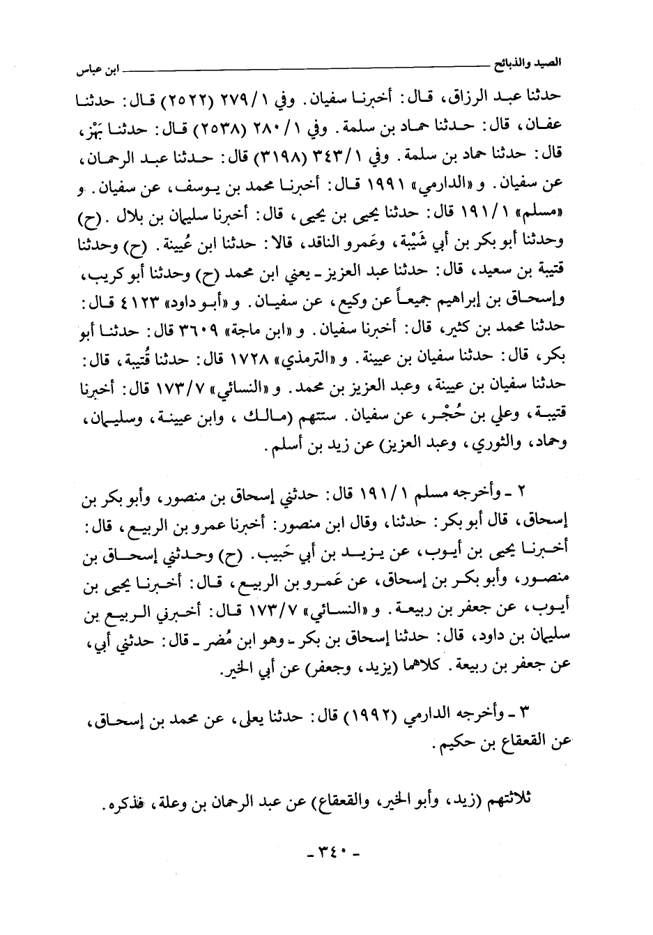حدثنا عبد الرزاق، أنبأنا سفيان، عن زيد بن أسلم. وفي ١/ ٢٧٩ (٢٥٢٢) قال: حدثنا عفان، حدثنا حماد بن سلمة، أخبرنا زيد بن أبي أسلم. وفي ١/ ٢٨٠ (٢٥٣٨) قال: حدثنا بَهْز، حدثنا حماد بن سلمة، حدثنا زيد بن أسلم. وفي ١/ ٣٤٣ (٣١٩٨) قال: حدثنا عبد الرحمن، عن سفيان، عن زيد. و"الدارِمِي" ١٩٨٥ قال: أخبرنا محمد بن يوسف، عن سفيان، عن زيد بن أسلم. وفي (١٩٨٦) قال: حدثنا يعلى، عن محمد بن إسحاق، عن القعقاع بن حكيم. وفي (٢٥٧١) قال: أخبرنا أحمد بن خالد، حدثنا محمد، هو ابن إسحاق، عن عبد الرحمن بن أبي يزيد، عن القعقاع بن حكيم. و"مسلم" ١/ ١٩١ (٧٤٠) قال: حدثنا يحيى بن يحيى، أخبرنا سليمان بن بلال، عن زيد بن أسلم. وفي (٧٤١) وحدثنا أبو بكر بن أبي شَيْبة، وعَمرو الناقد. قالا: حدثنا ابن عُيينة (ح) وحدثنا قتيبة بن سعيد، حدثنا عبد العزيز، يعني ابن محمد (ح) وحدثنا أبو كريب، وإسحاق بن إبراهيم جميعًا عن وكيع، عن سفيان، كلهم عن زيد بن أسلم. وفي (٧٤٢) قال: حدثني إسحاق بن منصور، وأبو بكربن إسحاق. قال أبو بكر: حدثنا. وقال ابن منصور: أخبرنا عمرو بن الربيع، أخبرنا يحيى بن أيوب، عن يزيد بن أبي حبيب، أن أبا الخير حدثه. قال: رأيت على ابن وعلة السبأي فروا، خمسته. فقال: مالك تمسه؟. وفي (٧٤٣) قال: وحدثني إسحاق بن منصور، وأبو بكر بن إسحاق، عن عمرو بن الربيع، أخبرنا يحيى بن أيوب، عن جعفر بن ربيعة، عن أبي الخير حدثه. و"أبو داود" ٤١٢٣ قال: حدثنا محمد بن كثير، أخبرنا سفيان، عن زيد بن أسلم. و (اابن ماجة) ٣٦٠٩ قال: حدثنا أبو بكر، حدثنا سفيان بن عيينة، عن زيد بن أسلم. والتِّرْمِذِيّ" ١٧٢٨ قال: حدثنا قُتيبة