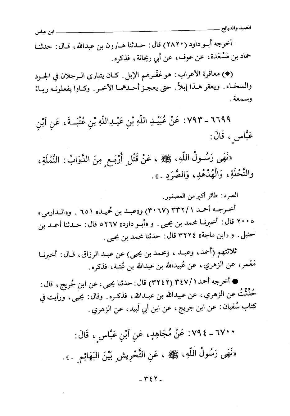 نَهَى رَسُولُ الله، صلى الله عليه وسلم، عَنْ قَتْلِ أرْبَعٍ مِنَ الدَّوَابِّ: النَّمْلَة، والنَّحْلَةِ، وَالْهُدْهُدِ، وَالصُّرَدِ.