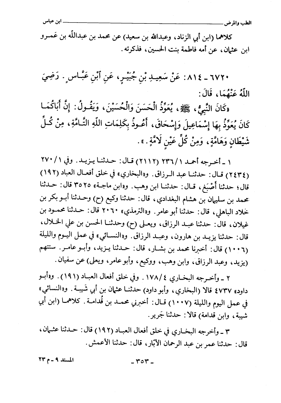 ١ - أخرجه أحمد ١/ ٢٣٦ (٢١١٢) قال: حدثنا يزيد، أخبرنا سفيان (ح) ويعلى، حدثنا سفيان. وفي ١/ ٢٧٠ (٢٤٣٢) قال: حدثنا عبد الرزاق، أخبرنا سفيان. و"البُخَارِي" ٤/ ١٧٨ (٣٣٧١)، وفي خلق أفعال العباد ١٩١ قال حدثنا عثمان بن أبي شيبة، حدثنا ابن جرير. وفي خلق أفعال العباد ١٩٢ قال: حدثنا أصبغ حدثنا ابن وهب عن سفيان الثوري بهذا. وفي (١٩٢) قال حدثنا عثمان، حدثنا عمر بن عبد الرحمن الأبار، حدثنا الأعمش. و"أبو داود" ٤٧٣٧ قال: حدثنا عثمان بن أبي شَيبة. حدثناجرير. و (اابن ماجة) ٣٥٢٥ قال: حدثنا محمد بن سليمان بن هشام البغدادي، حدثنا وكيع (ح) وحدثنا أبو بكر بن خلاد الباهلي، حدثنا أبو عامر. قالا: حدثنا سفيان. والتِّرْمِذِيّ" ٢٠٦٠ قال: حدثنا محمود بن غيلان، حدثنا عبد الرزاق، ويعلى عن سفيان (ح) حدثنا الحسن بن علي الخلال، حدثنا يزيد بن هارون، وعبد الرزاق. عن سفيان و"النَّسائي" في الكبرى ٧٦٧٩ وفي عمل اليوم والليلة ٠٠٦ اقال: أخبرنا محمد بن بشار. قال: حدثنا يزيد بن هارون، وأبو عامر. قالا: حدثنا سفيان. وفي (١٠٠٧) قال: أخبرني محمد بن قُدامة. قال: حدثنا جرير.
