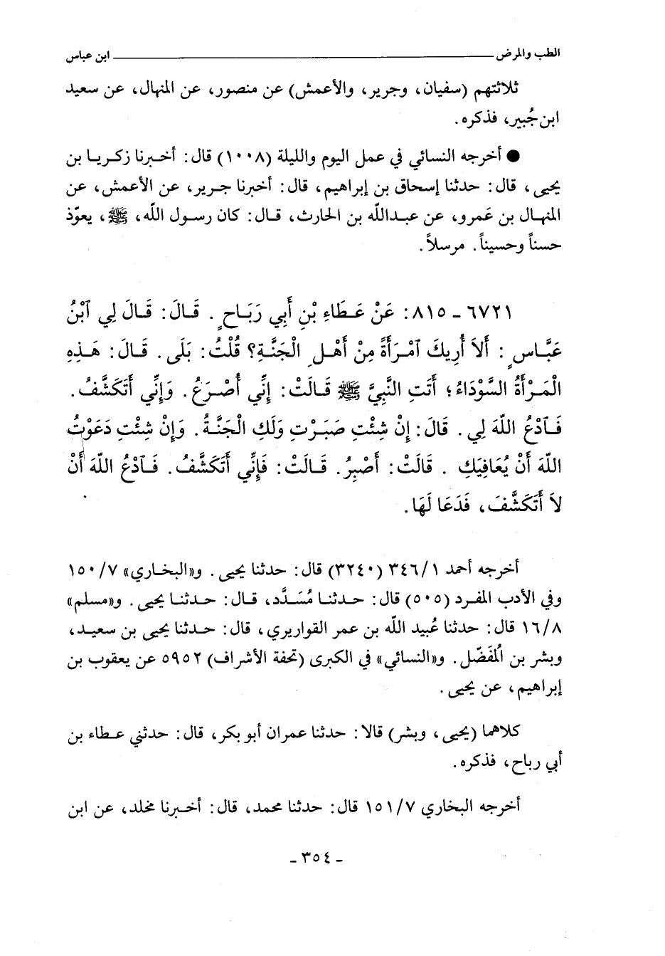 ٦٧٢١ - عن عَطَاءُ بْنُ أَبِى رَبَاحٍ قَالَ قَالَ لِى ابْنُ عَبَّاسٍ أَلَا أُرِيكَ امْرَأَةً مِنْ أَهْلِ الْجَنَّةِ قُلْتُ بَلَى. قَالَ: