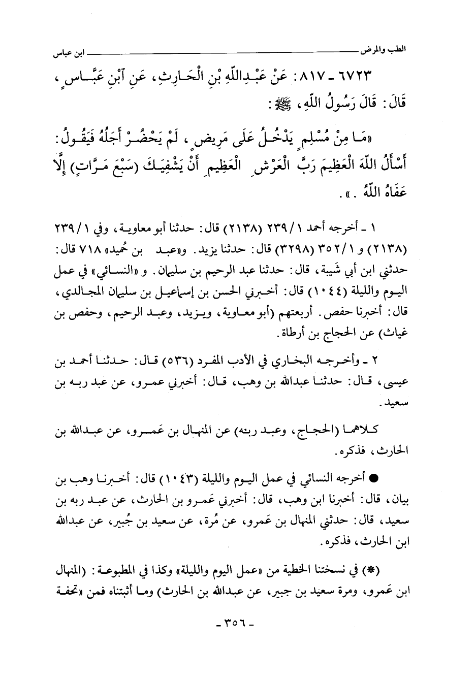 - في رواية أبي معاوية؛ حدثنا حجاج , عن المنهال بن عمرو , عن عبد الله بن الحارث , عن ابن عباس - قال أبو معاوية: أراه رفعه - قال: من عاد مريضا. الحديث.