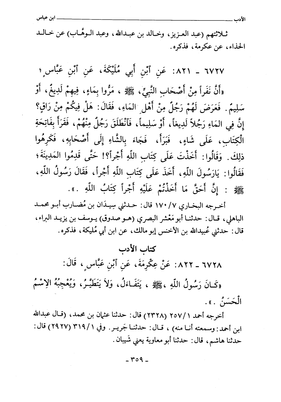 أَنَّ نَفَرًا مِنْ أَصْحَابِ رسول الله صلى الله عليه وسلم , مَرُّوا بحي من أحياء العرب , وفِيهِمْ لَدِيغٌ , أَوْ سَلِيمٌ. فقال: هَلْ فِيكُمْ مِنْ رَاقٍ؟ فَانْطَلَقَ رَجُلٌ مِنْهُمْ , فرقاه على شاء , فَبَرَأَ، فلما أتى أصحابه كَرِهُوا ذَلِكَ. فَقَالُوا: أَخَذْتَ عَلَى كِتَابِ الله أَجْرًا. فلما قَدِمُوا على رسول الله , صلى الله عليه وسلم أتوا رسول الله , صلى الله عليه وسلم , فأخبروه بذلك , فدعا رسول الله , صلى الله عليه وسلم , الرجل , فسأله. فقال: يا رَسُولَ اللَّهِ , إنا مررنا بحي من أحياء العرب , فيهم لديغ , أو سليم , فقالوا: هل فيكم من راق؟ فرقيته بفاتحة الكتاب , فبرأ. فَقَالَ رَسُولُ اللَّه , صلى الله عليه وسلم: إِنَّ أَحَقَّ مَا أَخَذْتُمْ عَلَيْهِ أَجْرًا كِتَابُ اللَّهِ.
