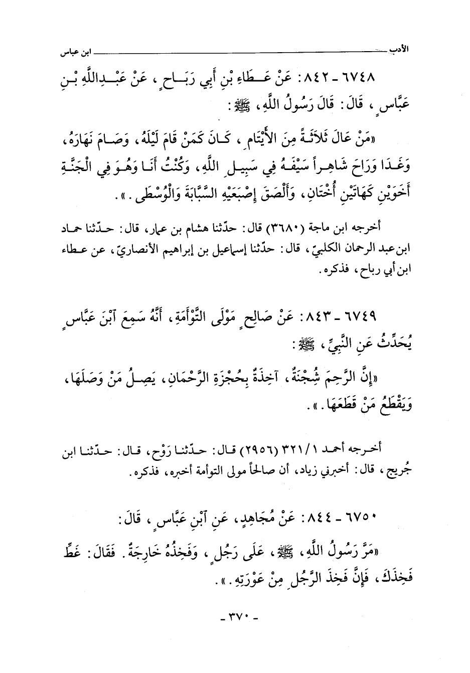 مَنْ عَالَ ثَلَاثَةً مِنَ الأيْتَامِ، كَانَ كَمَنْ قَامَ لَيْلَهُ، وَصَامَ نَهَارَهُ، وَغَدَا وَرَاحَ شَاهِرًا سَيْفَهُ فِي سَبِيلِ الله، وَكُنْتُ أَنَا وَهُوَ فِي الْجَنَّةِ أَخَوَيْنِ كَهَاتَيْنِ أُخْتَانِ، وَأَلْصَقَ إِصْبَعَيْهِ السَّبَّابَةَ وَالْوُسْطَى.