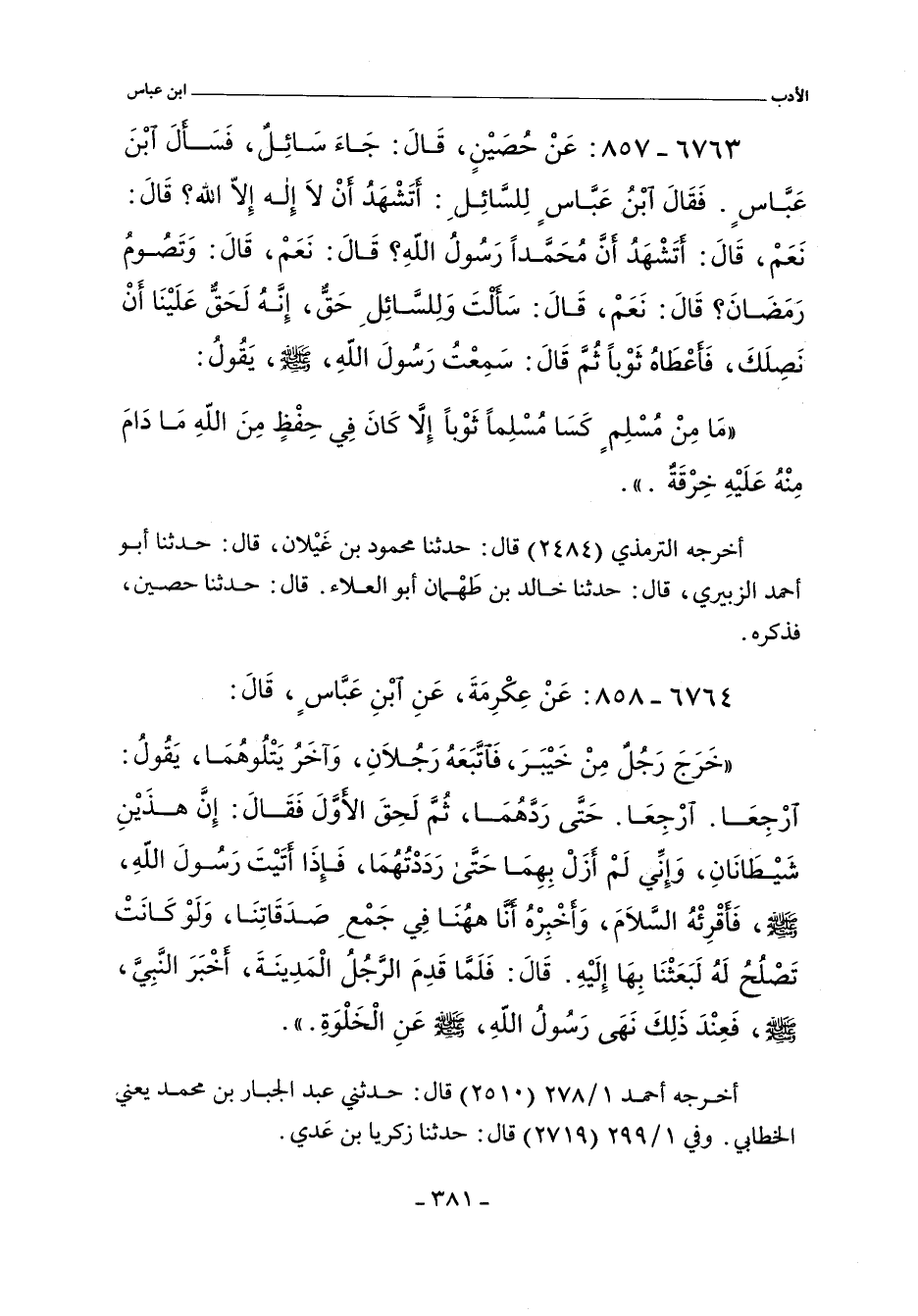 ٦٧٦٣ - عن حُصَيْنٌ , قَالَ: جَاءَ سَائِلٌ , فَسَأَلَ ابْنَ عَبَّاسٍ فَقَالَ ابْنُ عَبَّاسٍ لِلسَّائِلِ أَتَشْهَدُ أَنْ لَا إِلَهَ إِلَاّ اللَّهُ قَالَ نَعَمْ. قَالَ أَتَشْهَدُ أَنَّ مُحَمَّدًا رَسُولُ اللَّهِ قَالَ نَعَمْ. قَالَ وَتَصُومُ رَمَضَانَ قَالَ نَعَمْ. قَالَ سَأَلْتَ وَلِلسَّائِلِ حَقٌّ إِنَّهُ لَحَقٌّ عَلَيْنَا أَنْ نَصِلَكَ. فَأَعْطَاهُ ثَوْبًا ثُمَّ قَالَ سَمِعْتُ رَسُولَ اللَّهِ صلى الله عليه وسلم يَقُولُ: