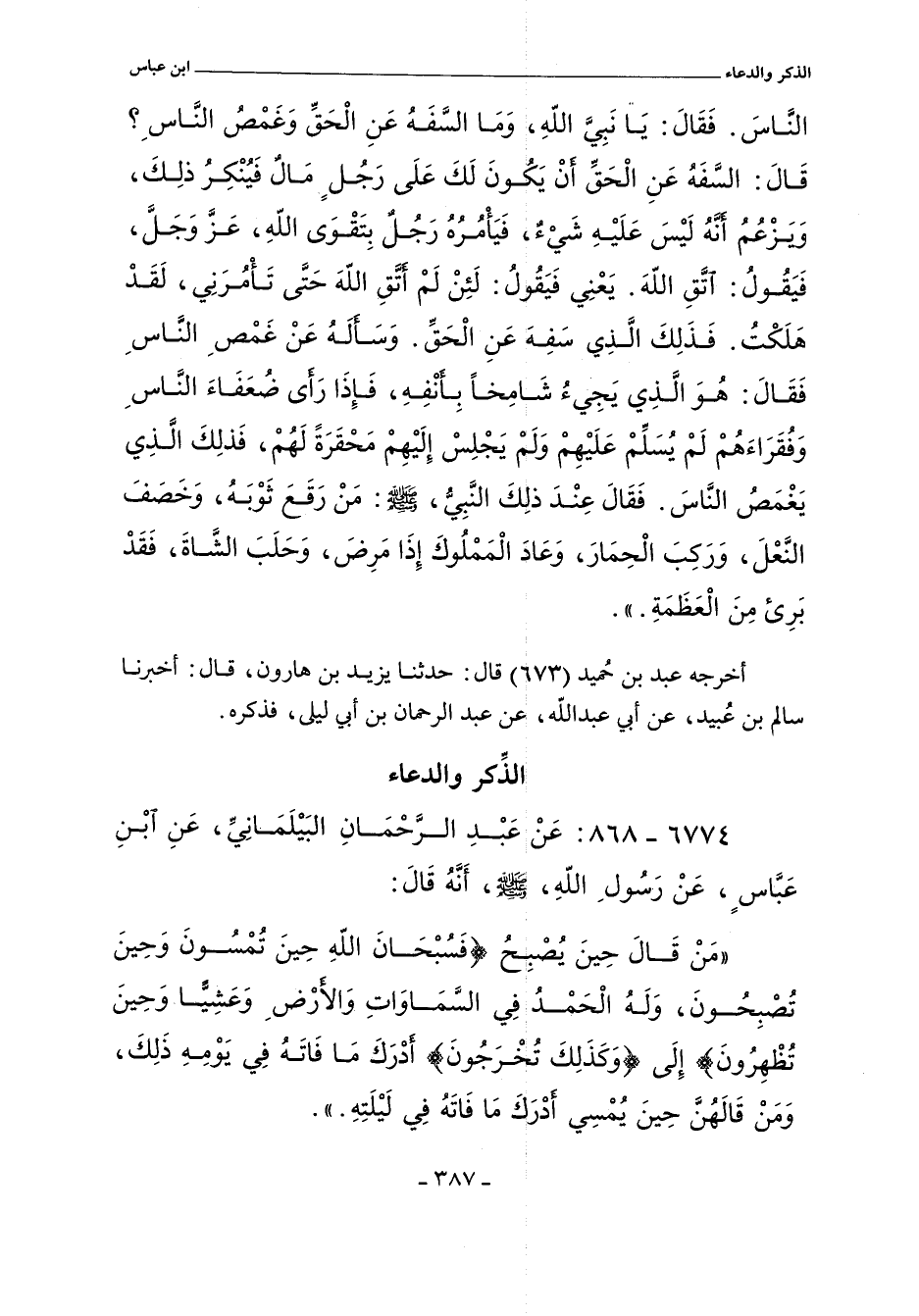 الناس فقال: يا نبي الله وما السفه عن الحق وغمص الناس قال السفه عن الحق أن يكون لك على رجل مال فينكر ذلك ويزعم أنه ليس عليه شيء فيأمره رجل بتقوى الله عز وجل فيقول اتق الله يعني فيقول لئن لم اتق الله حتى تأمرني لقد هلكت فذلك الذي سفه عن الحق وسأله عن غمص الناس فقال هو الذي يجيء شامخا بأنفه فإذا رأى ضعفاء الناس وفقراءهم لم يسلم عليهم ولم يجلس إليهم محقرة لهم فذلك الذي يغمص الناس فقال عند ذلك النبي صلى الله عليه وسلم من رفع ثوبه وخصف وركب الحمار وعاد المملوك إذا مرض وحلب الشاة فقد بريء من العظمة.