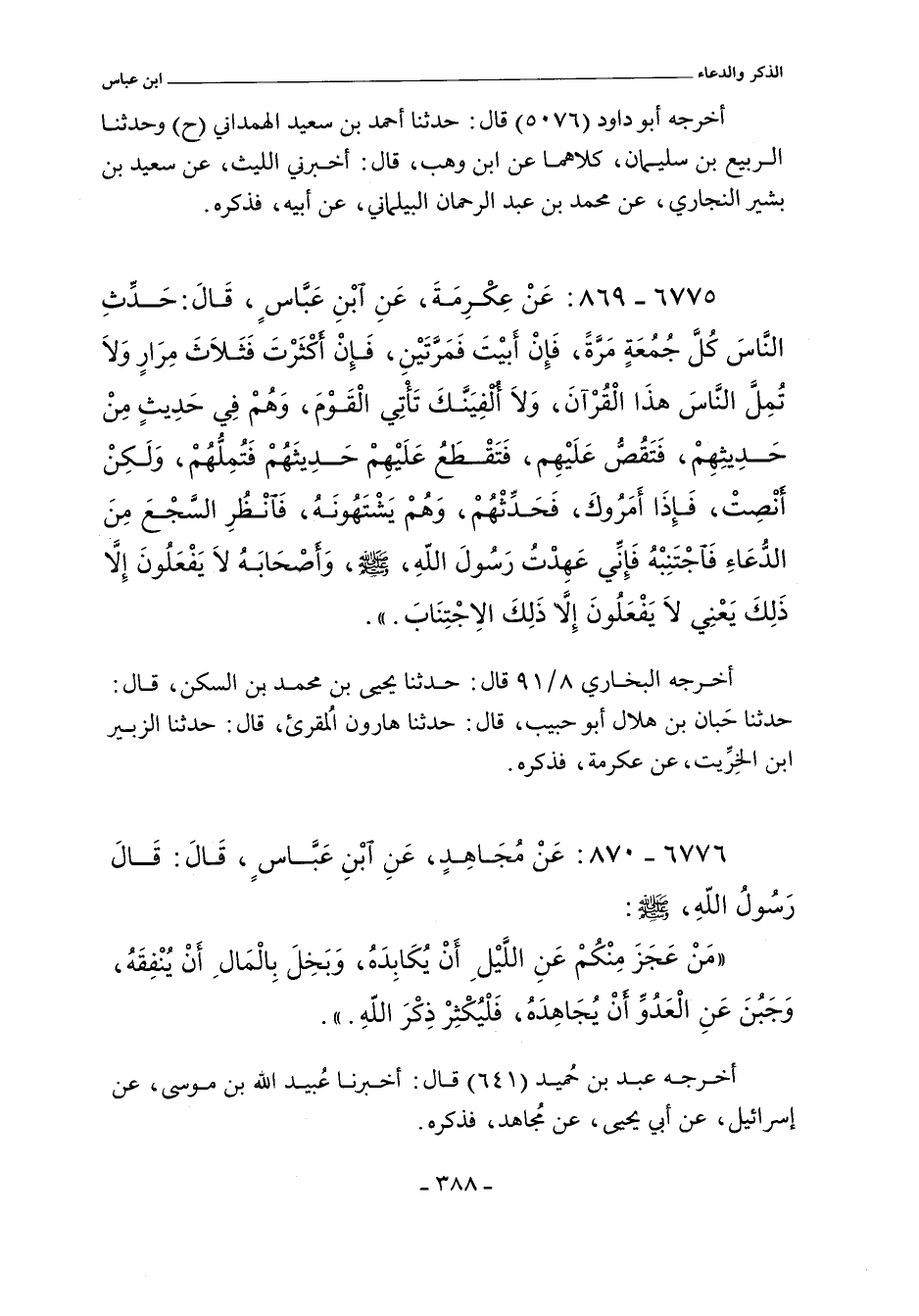 ٦٧٧٥ - عَنْ عِكْرِمَةَ عَنِ ابْنِ عَبَّاسٍ قَالَ حَدِّثِ النَّاسَ كُلَّ جُمُعَةٍ مَرَّةً، فَإِنْ أَبَيْتَ فَمَرَّتَيْنِ، فَإِنَّ أَكْثَرْتَ فَثَلَاثَ مِرَارٍ وَلَا تُمِلَّ النَّاسَ هَذَا الْقُرْآنَ، وَلَا أُلْفِيَنَّكَ تَأْتِى الْقَوْمَ وَهُمْ فِى حَدِيثٍ مِنْ حَدِيثِهِمْ فَتَقُصُّ عَلَيْهِمْ، فَتَقْطَعُ عَلَيْهِمْ حَدِيثَهُمْ فَتُمِلُّهُمْ، وَلَكِنْ أَنْصِتْ، فَإِذَا أَمَرُوكَ فَحَدِّثْهُمْ وَهُمْ يَشْتَهُونَهُ، فَانْظُرِ السَّجْعَ مِنْ الدُّعَاءِ فَاجْتَنِبْهُ، فَإِنِّى عَهِدْتُ رَسُولَ اللَّهِ صلى الله عليه وسلم وَأَصْحَابَهُ لَا يَفْعَلُونَ إِلَاّ ذَلِكَ. يَعْنِى لَا يَفْعَلُونَ إِلَاّ ذَلِكَ الاِجْتِنَابَ.