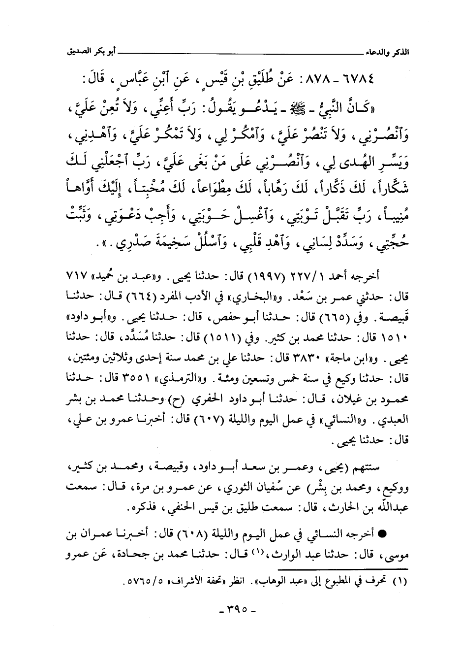 أخرجه أحمد ١/ ٢٢٧ (١٩٩٧) قال: حدثنا يحيى. و"عَبد بن حُميد" ٧١٧ قال: حدثني عمر بن سعد. و"البُخَارِي" في (الأدب المفرد) ٦٦٤ قال: حدثنا قَبيصة. وفي (٦٦٥) قال: حدثنا أبوحفص. قال: حدثنا يحيى. و"أبو داود" ١٥١٠ قال: حدثنا محمد بن كثير. وفي (١٥١١) قال: حدثنا مُسَدَّد، حدثنا يحيى. و (اابن ماجة) ٣٨٣٠ قال: حدثنا علي بن محمد سنة إحدى وثلاثين ومئتين، حدثنا وكيع في سنة خمس وتسعين ومئة. والتِّرْمِذِيّ" ٣٥٥١ قال: حدثنا محمود بن غيلان، حدثنا أبو داود الحفري (ح) قال محمود بن غيلان: وحدثنا محمد بن بشر العبدي. و"النَّسائي" في "عمل اليوم والليلة" ٦٠٧ قال: أخبرنا عمرو بن علي. قال: حدثنا يحيى.