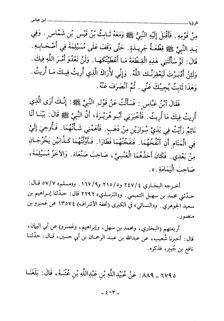 فَقَالَ ابْنُ عَبَّاسٍ فَسَأَلْتُ عَنْ قَوْلِ النَّبِىِّ صلى الله عليه وسلم إِنَّكَ أَرَى الَّذِى أُرِيتُ فِيكَ مَا أُرِيتُ فَأَخْبَرَنِى أَبُو هُرَيْرَةَ أَنَّ النَّبِىَّ صلى الله عليه وسلم قَالَ بَيْنَا أَنَا نَائِمٌ رَأَيْتُ فِى يَدَىَّ سِوَارَيْنِ مِنْ ذَهَبٍ فَأَهَمَّنِى شَأْنُهُمَا فَأُوحِىَ إِلَىَّ فِى الْمَنَامِ أَنِ انْفُخْهُمَا فَنَفَخْتُهُمَا فَطَارَا فَأَوَّلْتُهُمَا كَذَّابَيْنِ يَخْرُجَانِ مِنْ بَعْدِى فَكَانَ أَحَدُهُمَا الْعَنْسِىَّ صَاحِبَ صَنْعَاءَ وَالآخَرُ مُسَيْلِمَةَ صَاحِبَ الْيَمَامَةِ.