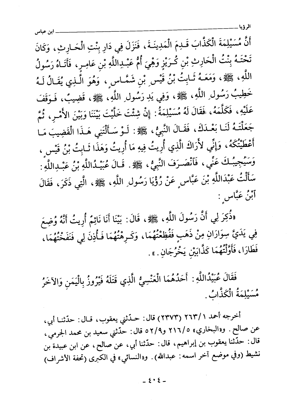 أَنَّ مُسَيْلِمَةَ الْكَذَّابَ قَدِمَ الْمَدِينَةَ، فَنَزَلَ فِى دَارِ بِنْتِ الْحَارِثِ، وَكَانَ تَحْتَهُ بِنْتُ الْحَارِثِ بْنِ كُرَيْزٍ، وَهْىَ أُمُّ عَبْدِ اللَّهِ بْنِ عَامِرٍ، فَأَتَاهُ رَسُولُ اللَّهِ صلى الله عليه وسلم وَمَعَهُ ثَابِتُ بْنُ قَيْسِ بْنِ شَمَّاسٍ، وَهْوَ الَّذِى يُقَالُ لَهُ خَطِيبُ رَسُولِ اللَّهِ صلى الله عليه وسلم وفي يَدِ رَسُولِ اللَّهِ صلى الله عليه وسلم قَضِيبٌ، فَوَقَفَ عَلَيْهِ فَكَلَّمَهُ فَقَالَ لَهُ مُسَيْلِمَةُ إِنْ شِئْتَ خَلَّيْتَ بَيْنَنَا وَبَيْنَ الأَمْرِ، ثُمَّ جَعَلْتَهُ لَنَا بَعْدَكَ. فَقَالَ النَّبِىُّ صلى الله عليه وسلم لَوْ سَأَلْتَنِى هَذَا الْقَضِيبَ مَا أَعْطَيْتُكَهُ وَإِنِّى لأَرَاكَ الَّذِى أُرِيتُ فِيهِ مَا أُرِيتُ، وَهَذَا ثَابِتُ بْنُ قَيْسٍ وَسَيُجِيبُكَ عَنِّى فَانْصَرَفَ النَّبِىُّ صلى الله عليه وسلم. قَالَ عُبَيْدُ اللَّهِ بْنُ عَبْدِ اللَّهِ سَأَلْتُ عَبْدَ اللَّهِ بْنَ عَبَّاسٍ عَنْ رُؤْيَا رَسُولِ اللَّهِ صلى الله عليه وسلم الَّتِى ذَكَرَ فَقَالَ ابْنُ عَبَّاسٍ ذُكِرَ لِى؛