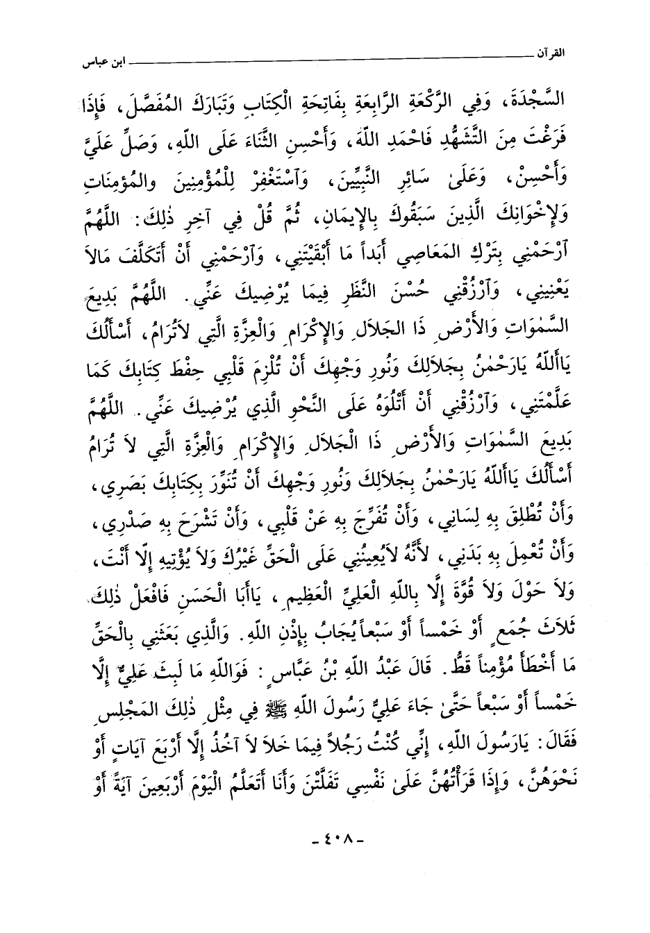 وَارْحَمْنِى أَنْ أَتَكَلَّفَ مَا لَا يَعْنِينِى وَارْزُقْنِى حُسْنَ النَّظَرِ فِيمَا يُرْضِيكَ عَنِّى اللَّهُمَّ بَدِيعَ السَّمَوَاتِ وَالأَرْضِ ذَا الْجَلَالِ وَالإِكْرَامِ وَالْعِزَّةِ الَّتِى لَا تُرَامُ أَسْأَلُكَ يَا اللَّهُ يَا رَحْمَنُ بِجَلَالِكَ وَنُورِ وَجْهِكَ أَنْ تُلْزِمَ قَلْبِى حِفْظَ كِتَابِكَ كَمَا عَلَّمْتَنِى وَارْزُقْنِى أَنْ أَتْلُوَهُ عَلَى النَّحْوِ الَّذِى يُرْضِيكَ عَنِّى اللَّهُمَّ بَدِيعَ السَّمَوَاتِ وَالأَرْضِ ذَا الْجَلَالِ وَالإِكْرَامِ وَالْعِزَّةِ الَّتِى لَا تُرَامُ أَسْأَلُكَ يَا اللَّهُ يَا رَحْمَنُ بِجَلَالِكَ وَنُورِ وَجْهِكَ أَنْ تُنَوِّرَ بِكِتَابِكَ بَصَرِى وَأَنْ تُطْلِقَ بِهِ لِسَانِى وَأَنْ تُفَرِّجَ بِهِ عَنْ قَلْبِى وَأَنْ تَشْرَحَ بِهِ صَدْرِى وَأَنْ تَغْسِلَ بِهِ بَدَنِى لأَنَّهُ لَا يُعِينُنِى عَلَى الْحَقِّ غَيْرُكَ وَلَا يُؤْتِيهِ إِلَاّ أَنْتَ وَلَا حَوْلَ وَلَا قُوَّةَ إِلَاّ بِاللَّهِ الْعَلِىِّ الْعَظِيمِ يَا أَبَا الْحَسَنِ تَفْعَلُ ذَلِكَ ثَلَاثَ جُمَعٍ أَوْ خَمْسَ أَوْ سَبْعَ تُجَابُ بِإِذْنِ اللَّهِ وَالَّذِى بَعَثَنِى بِالْحَقِّ مَا أَخْطَأَ مُؤْمِنًا قَطُّ قَالَ عَبْدُ اللَّهِ بْنُ عَبَّاسٍ فَوَاللَّهِ مَا لَبِثَ عَلِىٌّ إِلَاّ خَمْسًا أَوْ سَبْعًا حَتَّى جَاءَ عَلِىٌّ رَسُولَ اللَّهِ صلى الله عليه وسلم فِى مِثْلِ ذَلِكَ الْمَجْلِسِ فَقَالَ يَا رَسُولَ اللَّهِ إِنِّى كُنْتُ فِيمَا خَلَا لَا آخُذُ إِلَاّ أَرْبَعَ آيَاتٍ أَوْ نَحْوَهُنَّ وَإِذَا قَرَأْتُهُنَّ عَلَى نَفْسِى تَفَلَّتْنَ وَأَنَا أَتَعَلَّمُ الْيَوْمَ أَرْبَعِينَ آيَةً أَوْ