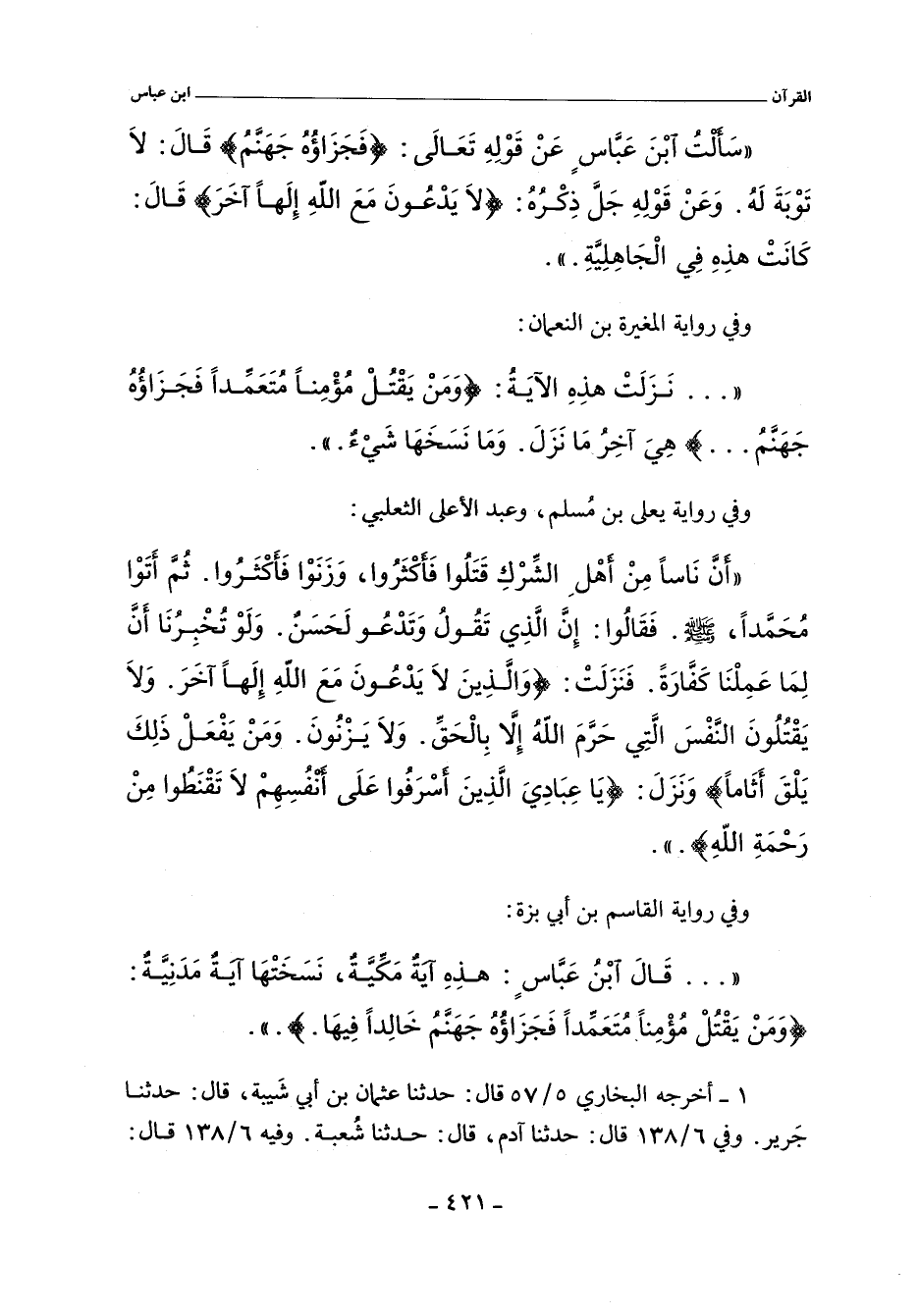 - وفي رواية: عَنْ سَعِيدِ بْنِ جُبَيْرٍ قَالَ سَأَلْتُ ابْنَ عَبَّاسٍ رضى الله عنهما عَنْ قَوْلِهِ تَعَالَى (فَجَزَاؤُهُ جَهَنَّمُ) قَالَ لَا تَوْبَةَ لَهُ. وَعَنْ قَوْلِهِ جَلَّ ذِكْرُهُ (لَا يَدْعُونَ مَعَ اللَّهِ إِلَهًا آخَرَ) قَالَ كَانَتْ هَذِهِ فِى الْجَاهِلِيَّةِ.