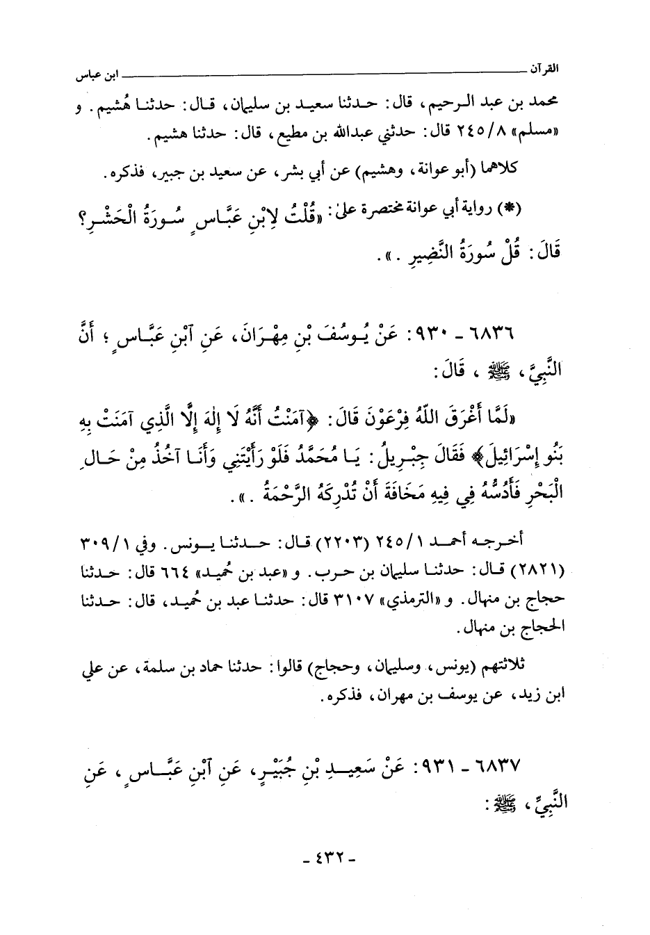 - أخرجه البخاري ٥/ ١١٣ (٤٠٢٩) و ٦/ ١٨٣ (٤٨٨٣) قال: حدثني الحسن بن مُدرك، حدثنا يحيى بن حماد، أخبرنا أبو عَوَانة، عن أبي بشر، عن سعيد بن جبير. قال: قلت لابن عباس: سورة الحشر؟ قال: قل سورة النضير (موقوفا.