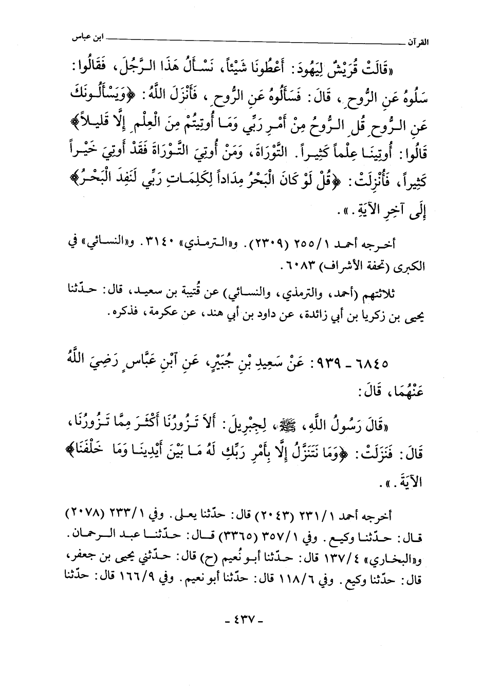 قَالَتْ قُرَيْشٌ لِيَهُودَ اعْطُونَا شَيْئًا نَسْأَلُ عَنْهُ هَذَا الرَّجُلَ فَقَالَ سَلُوهُ عَنِ الرُّوحِ قَالَ فَسَأَلُوهُ عَنِ الرُّوحِ فَأَنْزَلَ اللَّهُ (وَيَسْأَلُونَكَ عَنِ الرُّوحِ قُلِ الرُّوحُ مِنْ أَمْرِ رَبِّى وَمَا أُوتِيتُمْ مِنَ الْعِلْمِ إِلَاّ قَلِيلاً) قَالُوا أُوتِينَا عِلْمًا كَثِيرًا التَّوْرَاةُ وَمَنْ أُوتِىَ التَّوْرَاةَ فَقَدْ أُوتِىَ خَيْرًا كَثِيرًا فَأُنْزِلَتْ (قُلْ لَوْ كَانَ الْبَحْرُ مِدَادًا لِكَلِمَاتِ رَبِّى لَنَفِدَ الْبَحْرُ) إِلَى آخِرِ الآيَةِ.