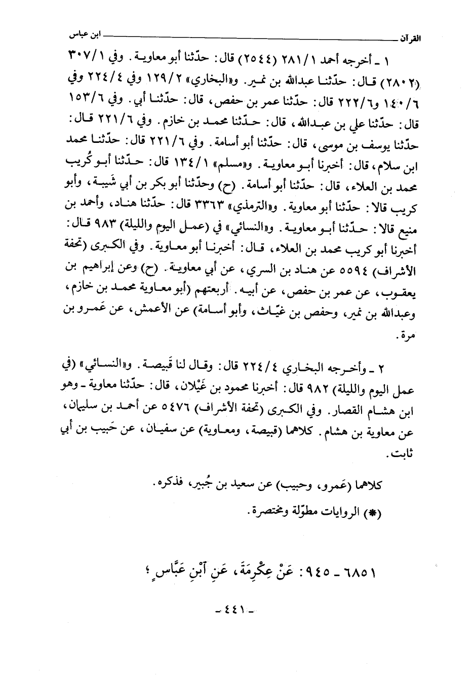 ١ - أخرجه أحمد ١/ ٢٨١ (٢٥٤٤) قال: حدثنا أبو معاوية. وفي ١/ ٣٠٧ (٢٨٠٢) قال: حدثنا عبد الله بن نمير. و"البُخَاريّ" ٢/ ١٢٩ (١٣٩٤) و ٤/ ٢٢٤ (٣٥٢٥) و ٦/ ١٤٠ (٤٧٧٠) و ٦/ ٢٢٢ (٤٩٧٣) قال: حدثنا عمر بن حفص بن غياث، حدثنا أبي. وفي ٦/ ١٥٣ (٤٨٠١) قال: حدثنا علي بن عبد الله، حدثنا محمد بن خازم. وفي ٦/ ٢٢١ (٤٩٧١) قال: حدثنا يوسف بن موسى، أبوأسامة. وفي (٤٩٧٢) قال: حدثنا محمد بن سلام، أخبرنا أبو معاوية. و"مسلم" ١/ ١٣٤ (٤٢٩) قال: حدثنا أبوكُريب محمد بن العلاء، حدثنا أبو أسامة. وفي (٤٣٠) قال: وحدثنا أبو بكر بن أبي شَيبة، وأبو كريب. قالا: حدثنا أبو معاوية. والتِّرْمِذِيّ" ٣٣٦٣ قال: حدثنا هناد، وأحمد بن منيع، حدثنا أبو معاوية. و"النَّسائي" في "الكبرى" ١١٣٦٢ قال: أخبرني إبراهيم بن يعقوب. قال: حدثني عمرو بن حفص بن غياث، قال: حدثنا أبي. وفي (١١٦٥٠) قال: أخبرنا هناد بن السري، عن أبي معاوية. وفي (١١٦٥٠) و"عمل اليوم والليلة" ٩٨٣ قال: أخبرنا أبو كريب محمد بن العلاء، قال: أخبرنا أبو معاوية.