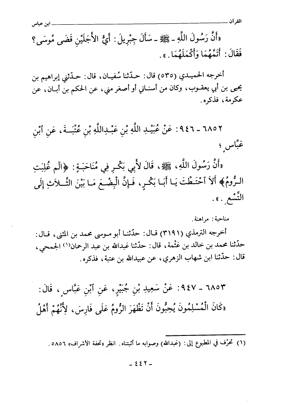 أَنَّ رَسُولَ اللَّهِ صلى الله عليه وسلم قَالَ لأَبِى بَكْرٍ فِى مُنَاحَبَةٍ (الم غُلِبَتِ الرُّومُ) أَلَاّ احْتَطْتَ يَاَ أَبَا بَكْرٍ فَإِنَّ الْبِضْعَ مَا بَيْنَ الثَّلَاثِ إِلَى التِّسْعِ.