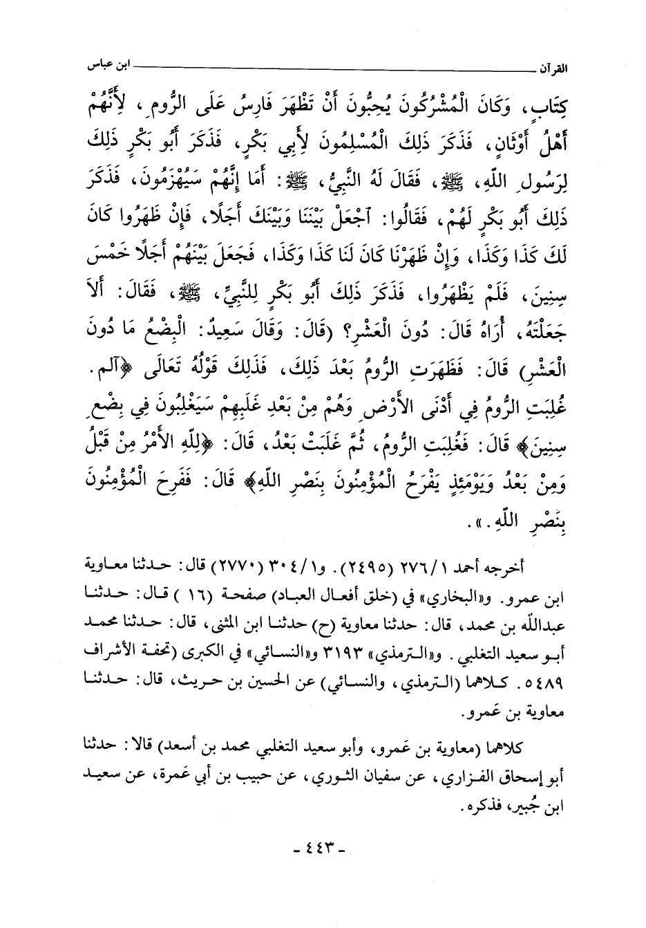 كِتَابٍ وَكَانَ الْمُشْرِكُونَ يُحِبُّونَ أَنْ تَظْهَرَ فَارِسُ عَلَى الرُّومِ لأَنَّهُمْ أَهْلُ أَوْثَانٍ فَذَكَرَ ذَلِكَ الْمُسْلِمُونَ لأَبِى بَكْرٍ فَذَكَرَ أَبُو بَكْرٍ ذَلِكَ لِرَسُولِ اللَّهِ صلى الله عليه وسلم فَقَالَ لَهُ النَّبِىُّ صلى الله عليه وسلم أَمَا إِنَّهُمْ سَيُهْزَمُونَ فَذَكَرَ ذَلِكَ أَبُو بَكْرٍ لَهُمْ فَقَالُوا اجْعَلْ بَيْنَنَا وَبَيْنَكَ أَجَلاً فَإِنْ ظَهَرُوا كَانَ لَكَ كَذَا وَكَذَا وَإِنْ ظَهَرْنَا كَانَ لَنَا كَذَا وَكَذَا فَجَعَلَ بَيْنَهُمْ أَجَلاً خَمْسَ سِنِينَ فَلَمْ يَظْهَرُوا فَذَكَرَ ذَلِكَ أَبُو بَكْرٍ لِلنَّبِىِّ صلى الله عليه وسلم فَقَالَ ألَا جَعَلْتَهُ أُرَاهُ قَالَ دُونَ الْعَشْرِ قَالَ وَقَالَ سَعِيدٌ الْبِضْعُ مَا دُونَ الْعَشْرِ. قَالَ فَظَهَرَتِ الرُّومُ بَعْدَ ذَلِكَ فَذَلِكَ قَوْلُهُ تَعَالَى (الم غُلِبَتِ الرُّومُ فِى أَدْنَى الأَرْضِ وَهُمْ مِنْ بَعْدِ غَلَبِهِمْ سَيَغْلِبُونَ فِى بِضْعِ سِنِينَ) قَالَ فَغُلِبَتِ الرُّومُ ثُمَّ غَلَبَتْ بَعْدُ قَالَ (لِلَّهِ الأَمْرُ مِنْ قَبْلُ وَمِنْ بَعْدُ وَيَوْمَئِذٍ يَفْرَحُ الْمُؤْمِنُونَ بِنَصْرِ اللَّهِ) قَالَ يَفْرَحُ الْمُؤْمِنُونَ بِنَصْرِ اللَّهِ.
