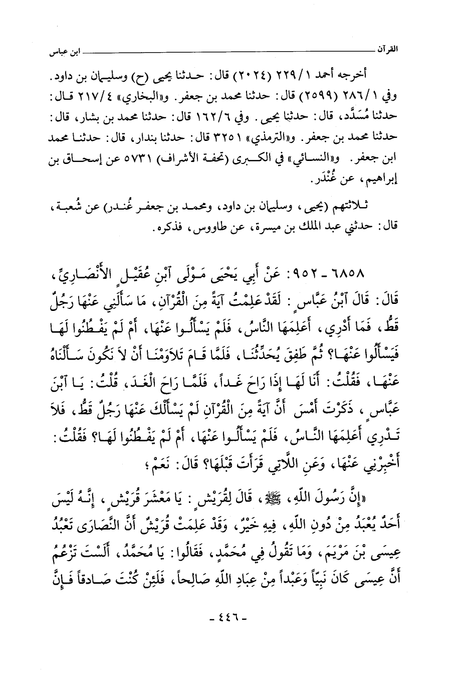 أخرجه أحمد ١/ ٢٢٩ (٢٠٢٤) قال: حدثنا يحيى، وسليمان بن داود. وفي ١/ ٢٨٦ (٢٥٩٩) قال: حدثنا محمد بن جعفر. و"البُخَارِي" ٤/ ٢١٧ (٣٤٩٧) قال: حدثنا مُسَدَّد، حدثنا يحيى. وفي ٦/ ١٦٢ (٤٨١٨) قال: حدثنا محمد بن بشار، حدثنا محمد بن جعفر. والتِّرْمِذِيّ" ٣٢٥١ قال: حدثنا بندار، حدثنا محمد ابن جعفر. و"النَّسائي" في "الكبرى" ١١٤١٠ قال: قال: أخبرنا إسحاق بن إبراهيم. قال: أخبرنا محمد بن جعفر.