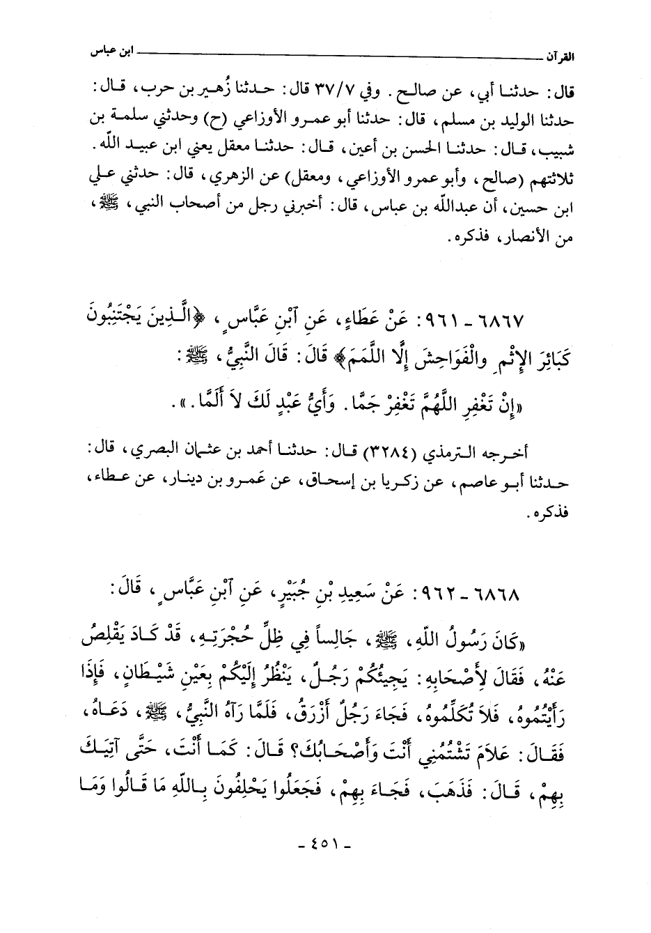 ٦٨٦٧ - عَنْ عَطَاءٍ، عَنِ ابن عَبَّاسٍ، (الَّذِينَ يَجْتَنِبُونَ كَبَائِرَ الإثْمِ والْفَوَاحِشَ إِلا اللَّمَمَ) قَالَ: قَالَ النَّبِيُّ، صلى الله عليه وسلم: