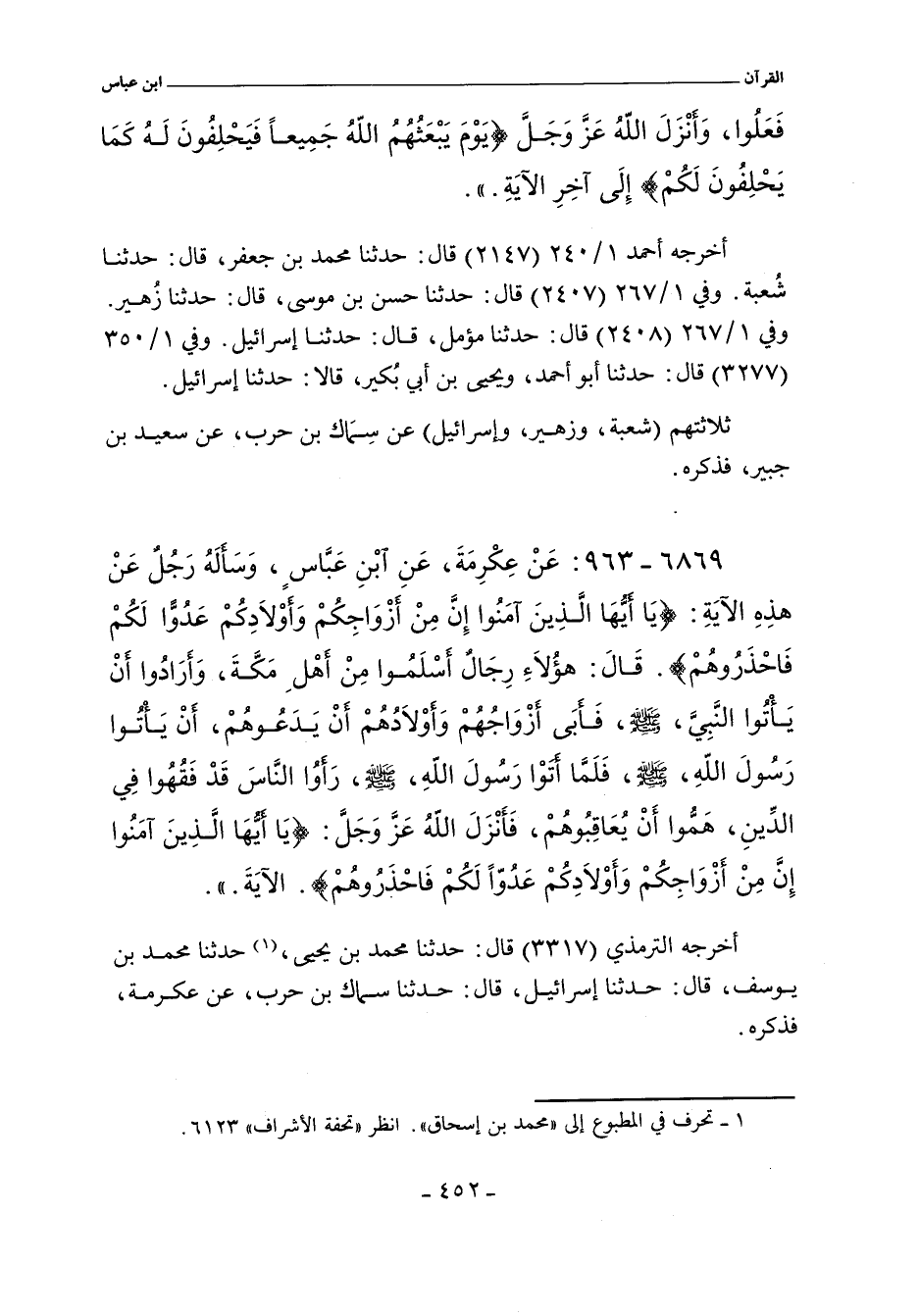 ٦٨٦٩ - عَنْ عِكْرِمَةَ عَنِ ابْنِ عَبَّاسٍ وَسَأَلَهُ رَجُلٌ عَنْ هَذِهِ الآيَةِ (يَا أَيُّهَا الَّذِينَ آمَنُوا إِنَّ مِنْ أَزْوَاجِكُمْ وَأَوْلَادِكُمْ عَدُوًّا لَكُمْ فَاحْذَرُوهُمْ) قَالَ: هَؤُلَاءِ رِجَالٌ أَسْلَمُوا مِنْ أَهْلِ مَكَّةَ وَأَرَادُوا أَنْ يَأْتُوا النَّبِىَّ صلى الله عليه وسلم فَأَبَى أَزْوَاجُهُمْ وَأَوْلَادُهُمْ أَنْ يَدَعُوهُمْ أَنْ يَأْتُوا رَسُولَ اللَّهِ صلى الله عليه وسلم فَلَمَّا أَتَوْا رَسُولَ اللَّهِ صلى الله عليه وسلم رَأَوُا النَّاسَ قَدْ فَقَهُوا فِى الدِّينِ هَمُّوا أَنْ يُعَاقِبُوهُمْ فَأَنْزَلَ اللَّهُ عَزَّ وَجَلَّ (يَا أَيُّهَا الَّذِينَ آمَنُوا إِنَّ مِنْ أَزْوَاجِكُمْ وَأَوْلَادِكُمْ عَدُوًّا لَكُمْ فَاحْذَرُوهُمْ) الآيَةَ.