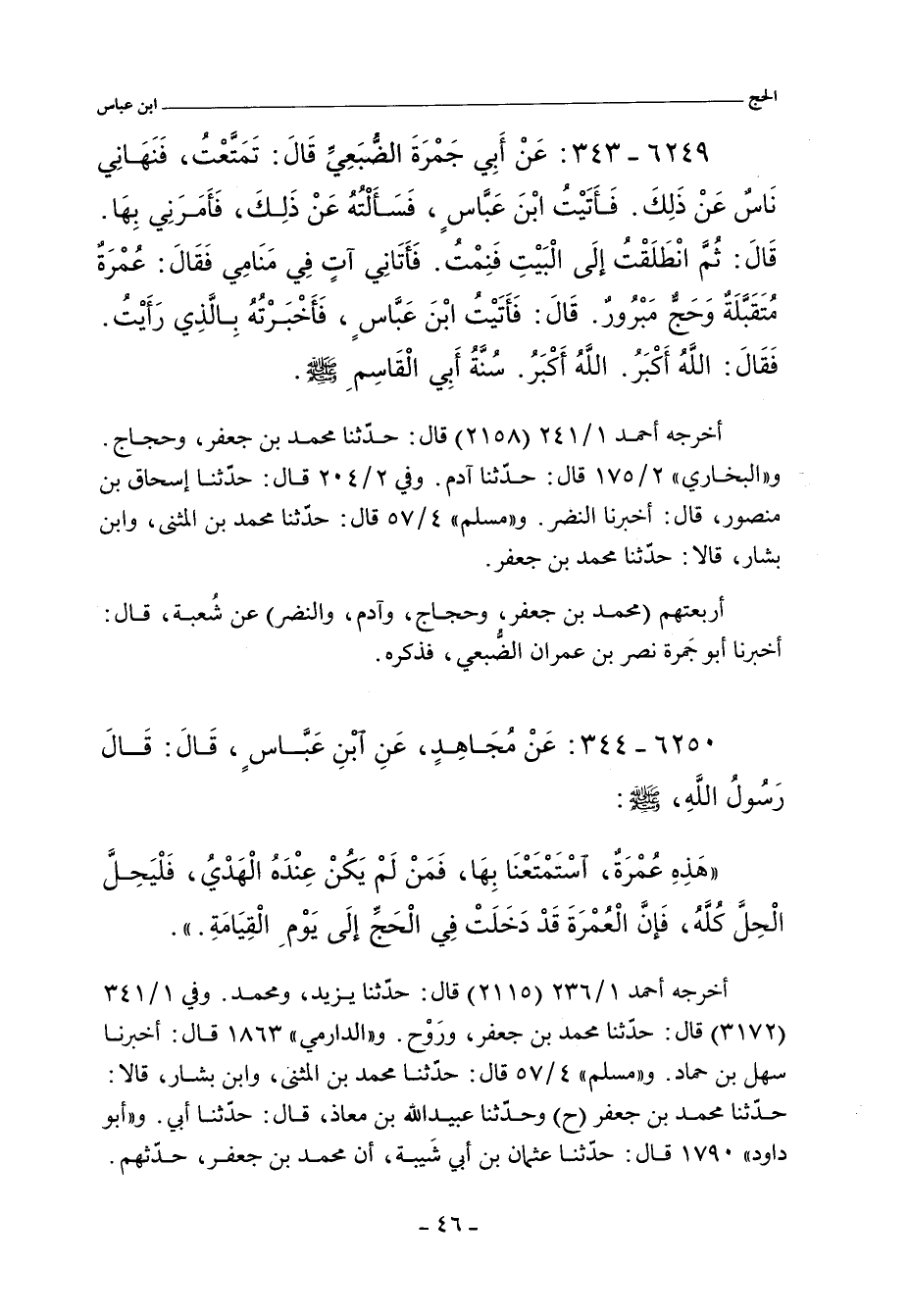 ٦٢٤٩ - عَنْ أَبِي جَمْرَةَ الضُّبَعِىَّ قَالَ تَمَتَّعْتُ فَنَهَانِى نَاسٌ عَنْ ذَلِكَ فَأَتَيْتُ ابْنَ عَبَّاسٍ فَسَأَلْتُهُ عَنْ ذَلِكَ فَأَمَرَنِى بِهَا. قَالَ ثُمَّ انْطَلَقْتُ إِلَى الْبَيْتِ فَنِمْتُ فَأَتَانِى آتٍ فِى مَنَامِى فَقَالَ عُمْرَةٌ مُتَقَبَّلَةٌ وَحَجٌّ مَبْرُورٌ قَالَ فَأَتَيْتُ ابْنَ عَبَّاسٍ فَأَخْبَرْتُهُ بِالَّذِى رَأَيْتُ فَقَالَ اللَّهُ أَكْبَرُ اللَّهُ أَكْبَرُ سُنَّةُ أَبِي الْقَاسِمِ صلى الله عليه وسلم.