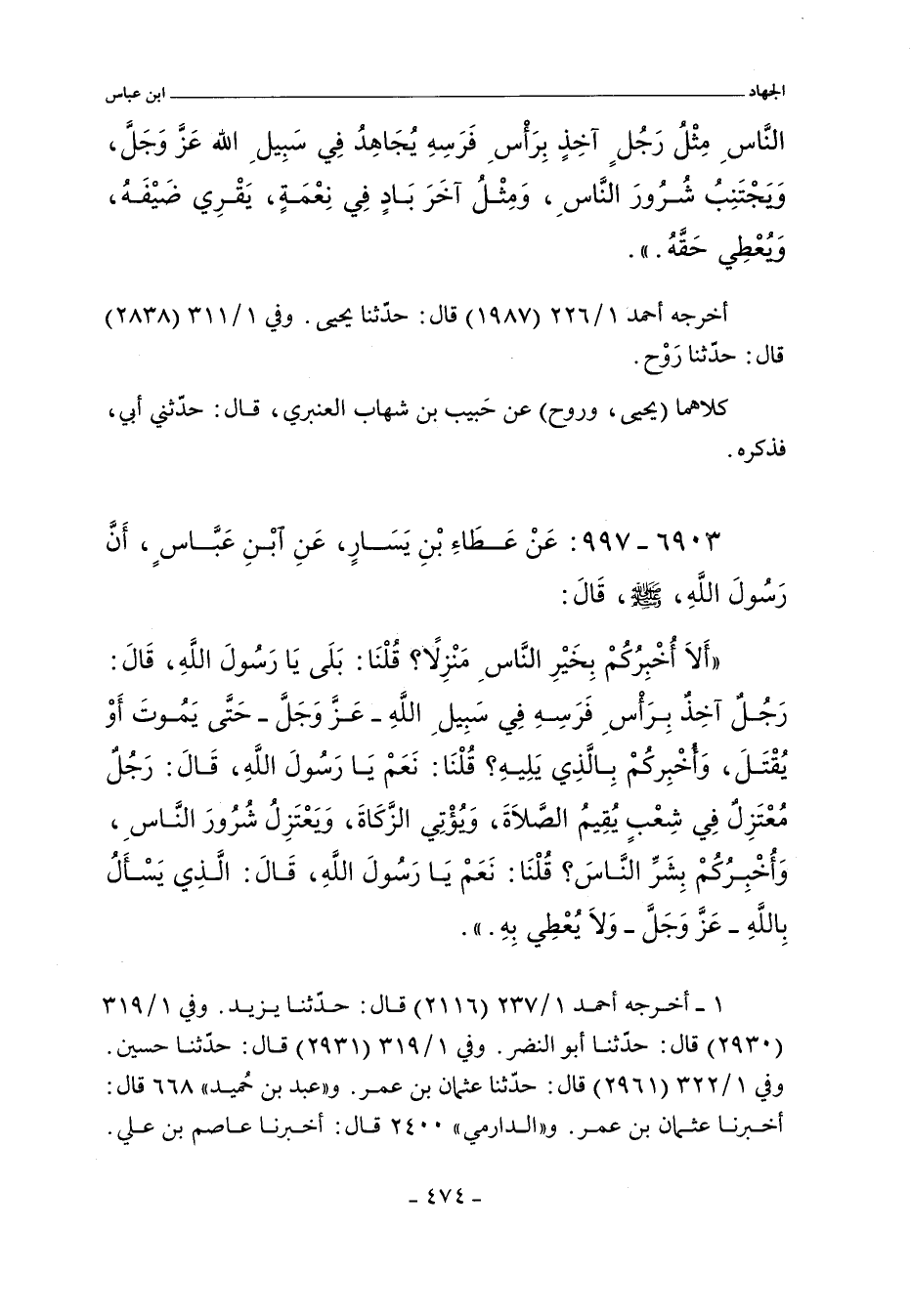 أَلَا أُخْبِرُكُمْ بِخَيْرِ النَّاسِ مَنْزِلاً قُلْنَا بَلَى يَا رَسُولَ اللَّهِ. قَالَ رَجُلٌ آخِذٌ بِرَأْسِ فَرَسِهِ فِى سَبِيلِ اللَّهِ عَزَّ وَجَلَّ حَتَّى يَمُوتَ أَوْ يُقْتَلَ وَأُخْبِرُكُمْ بِالَّذِى يَلِيهِ قُلْنَا نَعَمْ يَا رَسُولَ اللَّهِ. قَالَ رَجُلٌ مُعْتَزِلٌ فِى شِعْبٍ يُقِيمُ الصَّلَاةَ وَيُؤْتِى الزَّكَاةَ وَيَعْتَزِلُ شُرُورَ النَّاسِ وَأُخْبِرُكُمْ بِشَرِّ النَّاسِ قُلْنَا نَعَمْ يَا رَسُولَ اللَّهِ. قَالَ الَّذِى يُسْأَلُ بِاللَّهِ عَزَّ وَجَلَّ وَلَا يُعْطِى بِهِ.