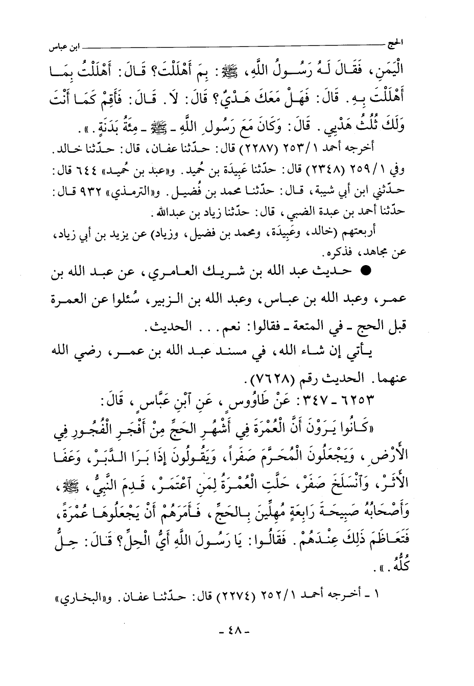 - حَدِيثُ عَبْدِ اللَّهِ بْنِ شَرِيكٍ الْعَامِرِىِّ , عَنْ عَبْدِ اللَّهِ بْنَ عُمَرَ , وَعَبْدَ اللَّهِ بْنَ عَبَّاسٍ , وَعَبْدَ اللَّهِ بْنَ الزُّبَيْرِ , سُئِلُوا عَنِ الْعُمْرَةِ قَبْلَ الْحَجِّ - فِى الْمُتْعَةِ - فَقَالُوا: نَعَمْ , سُنَّةُ رَسُولِ اللَّهِ صلى الله عليه وسلم. الحديث.