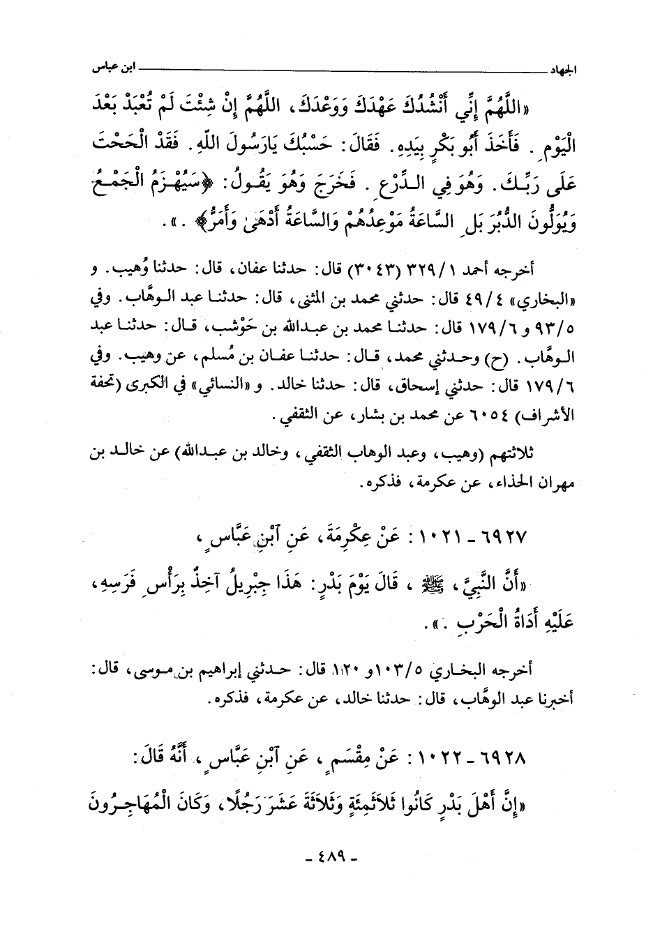 اللَّهُمَّ إِنِّى أَنْشُدُكَ عَهْدَكَ وَوَعْدَكَ، اللَّهُمَّ إِنْ تَشَأْ لَا تُعْبَدْ بَعْدَ الْيَوْمِ فَأَخَذَ أَبُو بَكْرٍ بِيَدِهِ فَقَالَ حَسْبُكَ يَا رَسُولَ اللَّهِ، أَلْحَحْتَ عَلَى رَبِّكَ. وَهْوَ يَثِبُ فِى الدِّرْعِ، فَخَرَجَ وَهْوَ يَقُولُ: (سَيُهْزَمُ الْجَمْعُ وَيُوَلُّونَ الدُّبُرَ).