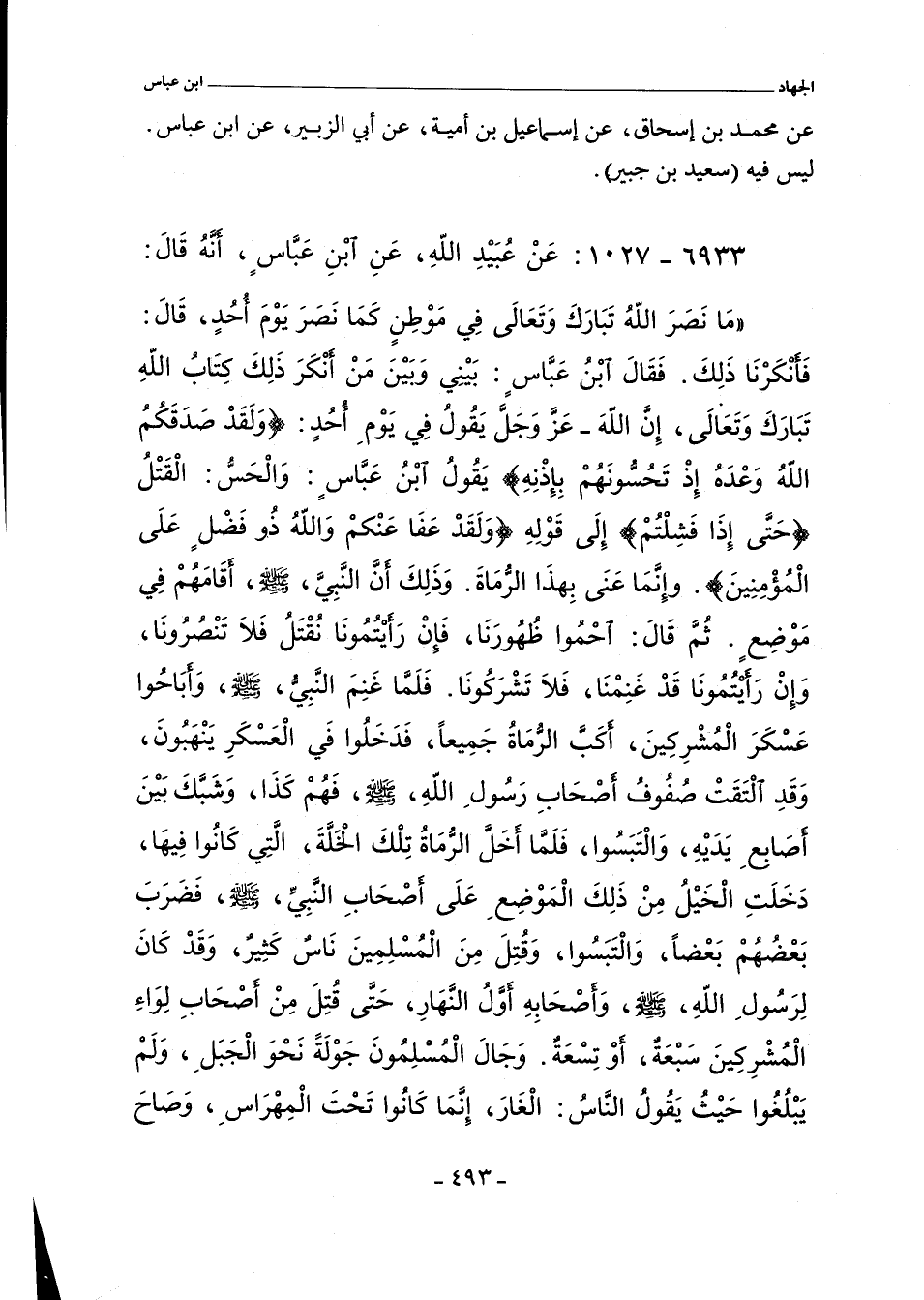 مَا نَصَرَ اللَّهُ تَبَارَكَ وَتَعَالَى فِى مَوْطِنٍ كَمَا نَصَرَ يَوْمَ أُحُدٍ. قَالَ فَأَنْكَرْنَا ذَلِكَ فَقَالَ ابْنُ عَبَّاسٍ بَيْنِى وَبَيْنَ مَنْ أَنْكَرَ ذَلِكَ كِتَابُ اللَّهِ تَبَارَكَ وَتَعَالَى إِنَّ اللَّهَ عَزَّ وَجَلَّ يَقُولُ فِى يَوْمِ أُحُدٍ (وَلَقَدْ صَدَقَكُمُ اللَّهُ وَعْدَهُ إِذْ تَحُسُّونَهُمْ بِإِذْنِهِ) يَقُولُ ابْنُ عَبَّاسٍ وَالْحَسُّ الْقَتْلُ (حَتَّى إِذَا فَشِلْتُمْ) إِلَى قَوْلِهِ (وَلَقَدْ عَفَا عَنْكُمْ وَاللَّهُ ذُو فَضْلٍ عَلَى الْمُؤْمِنِينَ) وَإِنَّمَا عَنَى بِهَذَا الرُّمَاةَ وَذَلِكَ أَنَّ النَّبِىَّ صلى الله عليه وسلم أَقَامَهُمْ فِى مَوْضِعٍ ثُمَّ قَالَ احْمُوا ظُهُورَنَا فَإِنْ رَأَيْتُمُونَا نُقْتَلُ فَلَا تَنْصُرُونَا وَإِنْ رَأَيْتُمُونَا قَدْ غَنِمْنَا فَلَا تَشْرَكُونَا فَلَمَّا غَنِمَ النَّبِىُّ صلى الله عليه وسلم وَأَبَاحُوا عَسْكَرَ الْمُشْرِكِينَ أَكَبَّ الرُّمَاةُ جَمِيعًا فَدَخَلُوا فِى الْعَسْكَرِ يَنْهَبُونَ وَقَدِ الْتَقَتْ صُفُوفُ أَصْحَابِ رَسُولِ اللَّهِ صلى الله عليه وسلم فَهُمْ كَذَا وَشَبَّكَ بَيْنَ أَصَابِعِ يَدَيْهِ وَالْتَبَسُوا فَلَمَّا أَخَلَّ الرُّمَاةُ تِلْكَ الْخَلَّةَ الَّتِى كَانُوا فِيهَا دَخَلَتِ الْخَيْلُ مِنْ ذَلِكَ الْمَوْضِعِ عَلَى أَصْحَابِ النَّبِىِّ صلى الله عليه وسلم فَضَرَبَ بَعْضُهُمْ بَعْضًا وَالْتَبَسُوا وَقُتِلَ مِنَ الْمُسْلِمِينَ نَاسٌ كَثِيرٌ وَقَدْ كَانَ لِرَسُولِ اللَّهِ صلى الله عليه وسلم وَأَصْحَابِهِ أَوَّلُ النَّهَارِ حَتَّى قُتِلَ مِنْ أَصْحَابِ لِوَاءِ الْمُشْرِكِينَ سَبْعَةٌ أَوْ تِسْعَةٌ وَجَالَ الْمُسْلِمُونَ جَوْلَةً نَحْوَ الْجَبَلِ وَلَمْ يَبْلُغُوا حَيْثُ يَقُولُ النَّاسُ الْغَارَ