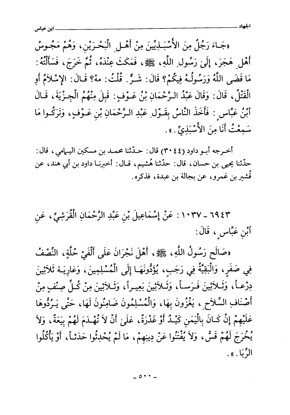 صَالَحَ رَسُولُ اللَّهِ صلى الله عليه وسلم أَهْلَ نَجْرَانَ عَلَى أَلْفَىْ حُلَّةٍ النِّصْفُ فِى صَفَرٍ وَالْبَقِيَّةُ فِى رَجَبٍ يُؤَدُّونَهَا إِلَى الْمُسْلِمِينَ وَعَارِيَةِ ثَلَاثِينَ دِرْعًا وَثَلَاثِينَ فَرَسًا وَثَلَاثِينَ بَعِيرًا وَثَلَاثِينَ مِنْ كُلِّ صِنْفٍ مِنْ أَصْنَافِ السِّلَاحِ يَغْزُونَ بِهَا وَالْمُسْلِمُونَ ضَامِنُونَ لَهَا حَتَّى يَرُدُّوهَا عَلَيْهِمْ إِنْ كَانَ بِالْيَمَنِ كَيْدٌ أَوْ غَدْرَةٌ عَلَى أَنْ لَا تُهْدَمَ لَهُمْ بَيْعَةٌ وَلَا يُخْرَجُ لَهُمْ قَسٌّ وَلَا يُفْتَنُوا عَنْ دِينِهِمْ مَا لَمْ يُحْدِثُوا حَدَثًا أَوْ يَأْكُلُوا الرِّبَا. قَالَ إِسْمَاعِيلُ فَقَدْ أَكَلُوا الرِّبَا.