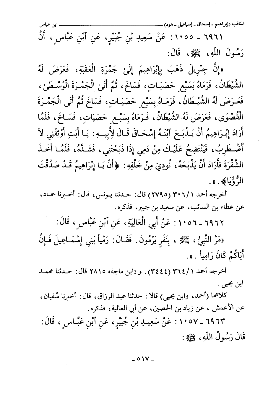 إِنَّ جِبْرِيلَ ذَهَبَ بِإِبْرَاهِيمَ إِلَى جَمْرَةِ الْعَقَبَةِ فَعَرَضَ لَهُ الشَّيْطَانُ فَرَمَاهُ بِسَبْعِ حَصَيَاتٍ فَسَاخَ ثُمَّ أَتَى بِهِ الْجَمْرَةَ الْوُسْطَى فَعَرَضَ لَهُ الشَّيْطَانُ فَرَمَاهُ بِسَبْعِ حَصَيَاتٍ فَسَاخَ ثُمَّ أَتَى بِهِ الْجَمْرَةَ الْقُصْوَى فَعَرَضَ لَهُ الشَّيْطَانُ فَرَمَاهُ بِسَبْعِ حَصَيَاتٍ فَسَاخَ فَلَمَّا أَرَادَ إِبْرَاهِيمُ أَنْ يَذْبَحَ ابْنَهُ إِسْحَاقَ قَالَ لأَبِيهِ يَا أَبَتِ أَوْثِقْنِى لَا أَضْطَرِبُ فَيَنْتَضِحَ عَلَيْكَ مِنْ دَمِى إِذَا ذَبَحْتَنِى فَشَدَّهُ. فَلَمَّا أَخَذَ الشَّفْرَةَ فَأَرَادَ أَنْ يَذْبَحَهُ نُودِىَ مِنْ خَلْفِهِ (أَنْ يَا إِبْرَاهِيمُ قَدْ صَدَّقْتَ الرُّؤْيَا).