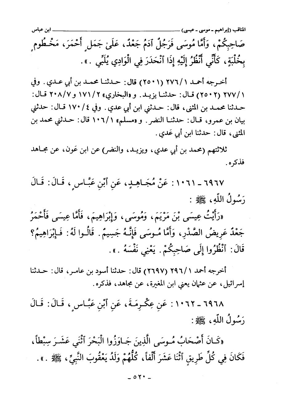 رَأَيْتُ عِيسَى بْنَ مَرْيَمَ , وَمُوسَى , وَإِبْرَاهِيمَ , فَأَمَّا عِيسَى فَأَحْمَرُ جَعْدٌ عَرِيضُ الصَّدْرِ وَأَمَّا مُوسَى فَإِنَّهُ جَسِيمٌ». قَالُوا لَهُ فَإِبْرَاهِيمُ قَالَ «انْظُرُوا إِلَى صَاحِبِكُمْ». يَعْنِى نَفْسَهُ.