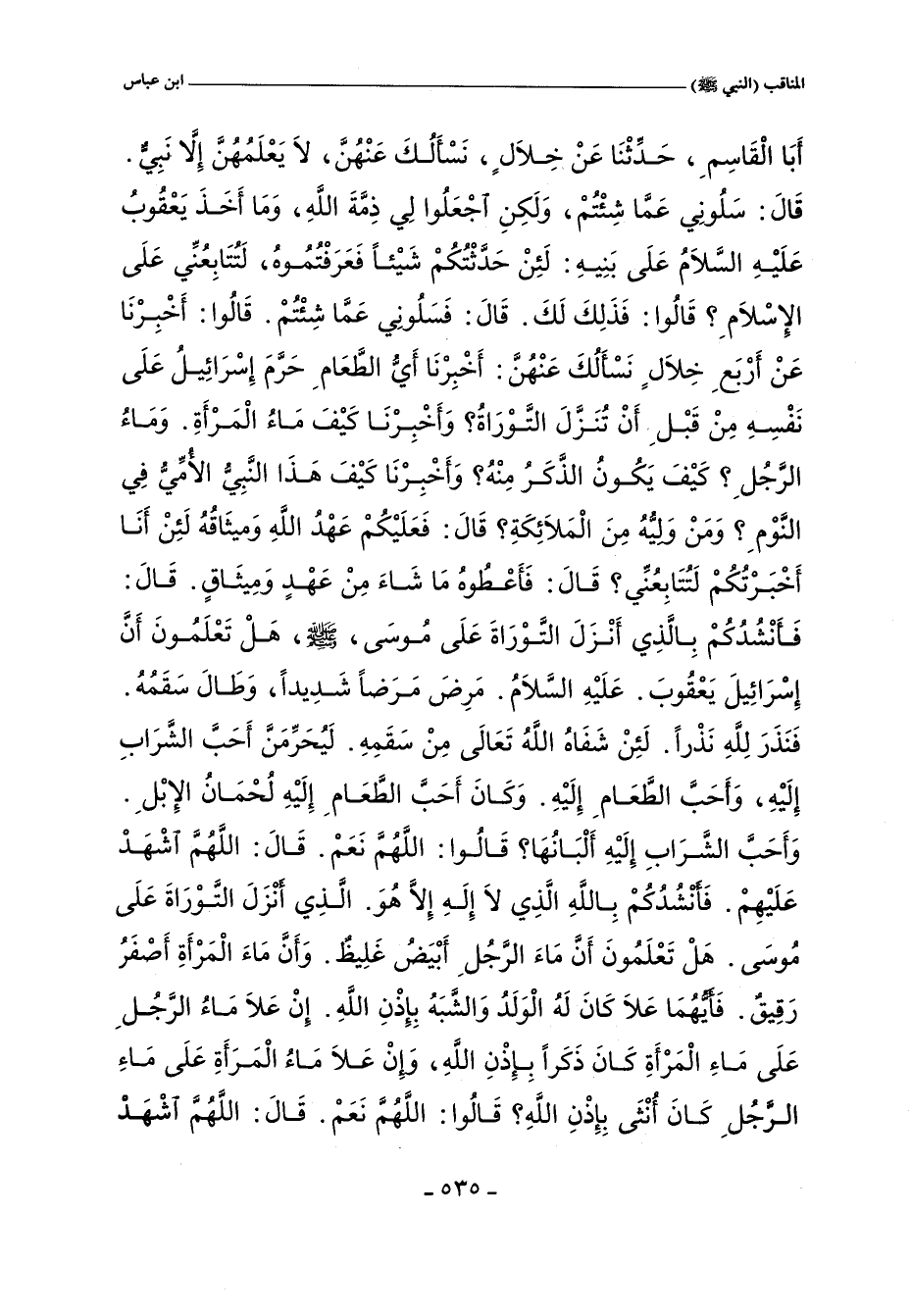 أَبَا الْقَاسِمِ حَدِّثْنَا عَنْ خِلَالٍ نَسْأَلُكَ عَنْهُنَّ لَا يَعْلَمُهُنَّ إِلَاّ نَبِىٌّ. قَالَ: سَلُونِى عَمَّا شِئْتُمْ وَلَكِنِ اجْعَلُوا لِى ذِمَّةَ اللَّهِ وَمَا أَخَذَ يَعْقُوبُ عَلَيْهِ السَّلَامُ عَلَى بَنِيهِ لَئِنْ حَدَّثْتُكُمْ شَيْئًا فَعَرَفْتُمُوهُ لَتُتَابِعُنِّى عَلَى الإِسْلَامِ قَالُوا فَذَلِكَ لَكَ. قَالَ فَسَلُونِى عَمَّا شِئْتُمْ قَالُوا أَخْبِرْنَا عَنْ أَرْبَعِ خِلَالٍ نَسْأَلُكَ عَنْهُنَّ أَخْبِرْنَا أَىُّ الطَّعَامِ حَرَّمَ إِسْرَائِيلُ عَلَى نَفْسِهِ مِنْ قَبْلِ أَنْ تُنَزَّلَ التَّوْرَاةُ وَأَخْبِرْنَا كَيْفَ مَاءُ الْمَرْأَةِ وَمَاءُ الرَّجُلِ كَيْفَ يَكُونُ الذَّكَرُ مِنْهُ وَأَخْبِرْنَا كَيْفَ هَذَا النَّبِىُّ الأُمِّىُّ فِى النَّوْمِ وَمَنْ وَلِيُّهُ مِنَ الْمَلَائِكَةِ. قَالَ فَعَلَيْكُمْ عَهْدُ اللَّهِ وَمِيثَاقُهُ لَئِنْ أَنَا أَخْبَرْتُكُمْ لَتُتَابِعُنِّى قَالَ فَأَعْطَوْهُ مَا شَاءَ مِنْ عَهْدٍ وَمِيثَاقٍ. قَالَ فَأَنْشُدُكُمْ بِالَّذِى أَنْزَلَ التَّوْرَاةَ عَلَى مُوسَى صلى الله عليه وسلم هَلْ تَعْلَمُونَ أَنَّ إِسْرَائِيلَ يَعْقُوبَ عَلَيْهِ السَّلَامُ مَرِضَ مَرَضًا شَدِيدًا وَطَالَ سَقَمُهُ فَنَذَرَ لِلَّهِ نَذْرًا لَئِنْ شَفَاهُ اللَّهُ تَعَالَى مِنْ سَقَمِهِ لَيُحَرِّمَنَّ أَحَبَّ الشَّرَابِ إِلَيْهِ وَأَحَبَّ الطَّعَامِ إِلَيْهِ وَكَانَ أَحَبَّ الطَّعَامِ إِلَيْهِ لُحْمَانُ الإِبِلِ وَأَحَبَّ الشَّرَابِ إِلَيْهِ أَلْبَانُهَا قَالُوا اللَّهُمَّ نَعَمْ. قَالَ اللَّهُمَّ اشْهَدْ