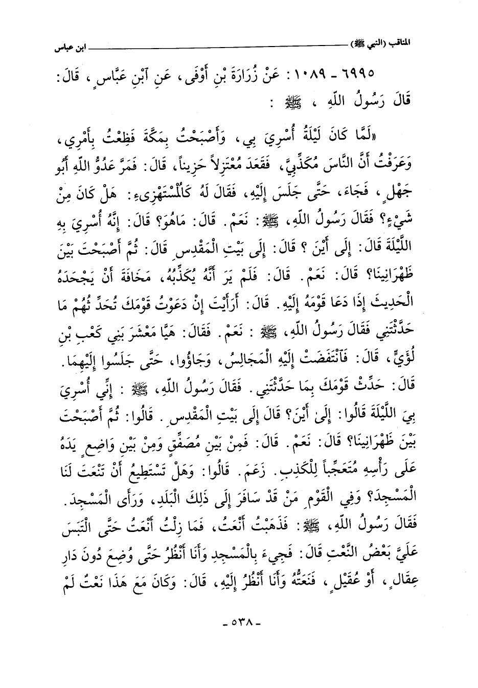 لَمَّا كَانَ لَيْلَةُ أُسْرِىَ بِى وَأَصْبَحْتُ بِمَكَّةَ فَظِعْتُ بِأَمْرِى وَعَرَفْتُ أَنَّ النَّاسَ مُكَذِّبِىَّ فَقَعَدَ مُعْتَزِلاً حَزِينًا قَالَ فَمَرَّ عَدُوُّ اللَّهِ أَبُو جَهْلٍ فَجَاءَ حَتَّى جَلَسَ إِلَيْهِ فَقَالَ لَهُ كَالْمُسْتَهْزِئِ هَلْ كَانَ مِنْ شَىْءٍ فَقَالَ رَسُولُ اللَّهِ صلى الله عليه وسلم نَعَمْ قَالَ مَا هُوَ قَالَ إِنَّهُ أُسْرِىَ بِى اللَّيْلَةَ قَالَ إِلَى أَيْنَ قَالَ إِلَى بَيْتِ الْمَقْدِسِ قَالَ ثُمَّ أَصْبَحْتَ بَيْنَ ظَهْرَانَيْنَا. قَالَ نَعَمْ قَالَ فَلَمْ يَرَ أَنَّهُ يُكَذِّبُهُ مَخَافَةَ أَنْ يَجْحَدَهُ الْحَدِيثَ إِذَا دَعَا قَوْمَهُ إِلَيْهِ قَالَ أَرَأَيْتَ إِنْ دَعَوْتُ قَوْمَكَ تُحَدِّثُهُمْ مَا حَدَّثْتَنِى فَقَالَ رَسُولُ اللَّهِ صلى الله عليه وسلم نَعَمْ فَقَالَ هَيَا يَا مَعْشَرَ بَنِى كَعْبِ بْنِ لُؤَىٍّ حَتَّى قَالَ فَانْتَفَضَتْ إِلَيْهِ الْمَجَالِسُ وَجَاءُوا حَتَّى جَلَسُوا إِلَيْهِمَا قَالَ حَدِّثْ قَوْمَكَ بِمَا حَدَّثَتْنِى. فَقَالَ رَسُولُ اللَّهِ صلى الله عليه وسلم إِنِّى أُسْرِىَ بِى اللَّيْلَةَ قَالُوا إِلَى أَيْنَ قُلْتُ إِلَى بَيْتِ الْمَقْدِسِ قَالُوا ثُمَّ أَصْبَحْتَ بَيْنَ ظَهْرَانَيْنَا قَالَ نَعَمْ قَالَ فَمِنْ بَيْنِ مُصَفِّقٍ وَمِنْ بَيْنِ وَاضِعٍ يَدَهُ عَلَى رَأْسِهِ مُتَعَجِّبًا لِلْكَذِبِ زَعَمَ قَالُوا وَهَلْ تَسْتَطِيعُ أَنْ تَنْعَتَ لَنَا الْمَسْجِدَ وَفِى الْقَوْمِ مَنْ قَدْ سَافَرَ إِلَى ذَلِكَ الْبَلَدِ وَرَأَى الْمَسْجِدَ. فَقَالَ رَسُولُ اللَّهِ صلى الله عليه وسلم فَذَهَبْتُ أَنْعَتُ فَمَا زِلْتُ أَنْعَتُ حَتَّى الْتَبَسَ عَلَىَّ بَعْضُ النَّعْتِ قَالَ فَجِئَ بِالْمَسْجِدِ وَأَنَا
