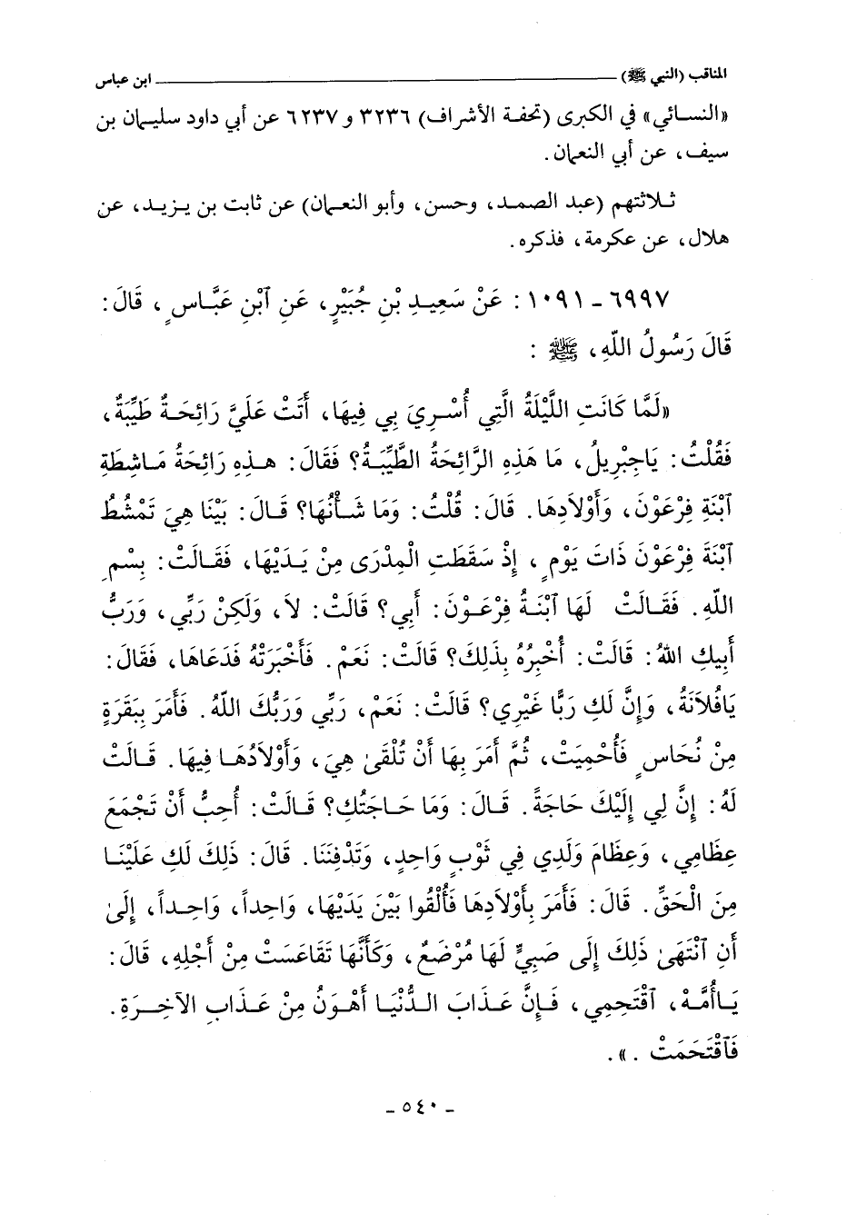لَمَّا كَانَ اللَّيْلَةُ الَّتِى أُسْرِىَ بِى فِيهَا أَتَتْ عَلَىَّ رَائِحَةٌ طَيِّبَةٌ فَقُلْتُ يَا جِبْرِيلُ مَا هَذِهِ الرَّائِحَةُ الطَّيِّبَةُ فَقَالَ هَذِهِ رَائِحَةُ مَاشِطَةِ ابْنَةِ فِرْعَوْنَ وَأَوْلَادِهَا. قَالَ قُلْتُ وَمَا شَأْنُهَا قَالَ بَيْنَا هِىَ تَمْشُطُ ابْنَةَ فِرْعَوْنَ ذَاتَ يَوْمٍ إِذْ سَقَطَتِ الْمِدْرَى مِنْ يَدَيْهَا فَقَالَتْ بِسْمِ اللَّهِ. فَقَالَتْ لَهَا ابْنَةُ فِرْعَوْنَ أَبِى قَالَتْ لَا وَلَكِنْ رَبِّى وَرَبُّ أَبِيكِ اللَّهُ. قَالَتْ أُخْبِرُهُ بِذَلِكَ قَالَتْ نَعَمْ. فَأَخْبَرَتْهُ فَدَعَاهَا فَقَالَ يَا فُلَانَةُ وَإِنَّ لَكَ رَبًّا غَيْرِى قَالَتْ نَعَمْ رَبِّى وَرَبُّكَ اللَّهُ. فَأَمَرَ بِبَقَرَةٍ مِنْ نُحَاسٍ فَأُحْمِيَتْ ثُمَّ أَمَرَ بِهَا أَنْ تُلْقَى هِىَ وَأَوْلَادُهَا فِيهَا قَالَتْ لَهُ إِنَّ لِى إِلَيْكَ حَاجَةً. قَالَ وَمَا حَاجَتُكِ قَالَتْ أُحِبُّ أَنْ تَجْمَعَ عِظَامِى وَعِظَامَ وَلَدِى فِى ثَوْبٍ وَاحِدٍ وَتَدْفِنَنَا. قَالَ ذَلِكَ لَكِ عَلَيْنَا مِنَ الْحَقِّ. قَالَ فَأَمَرَ بِأَوْلَادِهَا فَأُلْقُوا بَيْنَ يَدَيْهَا وَاحِدًا وَاحِدًا إِلَى أَنِ انْتَهَى ذَلِكَ إِلَى صَبِىٍّ لَهَا مُرْضَعٍ وَكَأَنَّهَا تَقَاعَسَتْ مِنْ أَجْلِهِ قَالَ يَا أُمَّهْ اقْتَحِمِى فَإِنَّ عَذَابَ الدُّنْيَا أَهْوَنُ مِنْ عَذَابِ الآخِرَةِ فَاقْتَحَمَتْ.