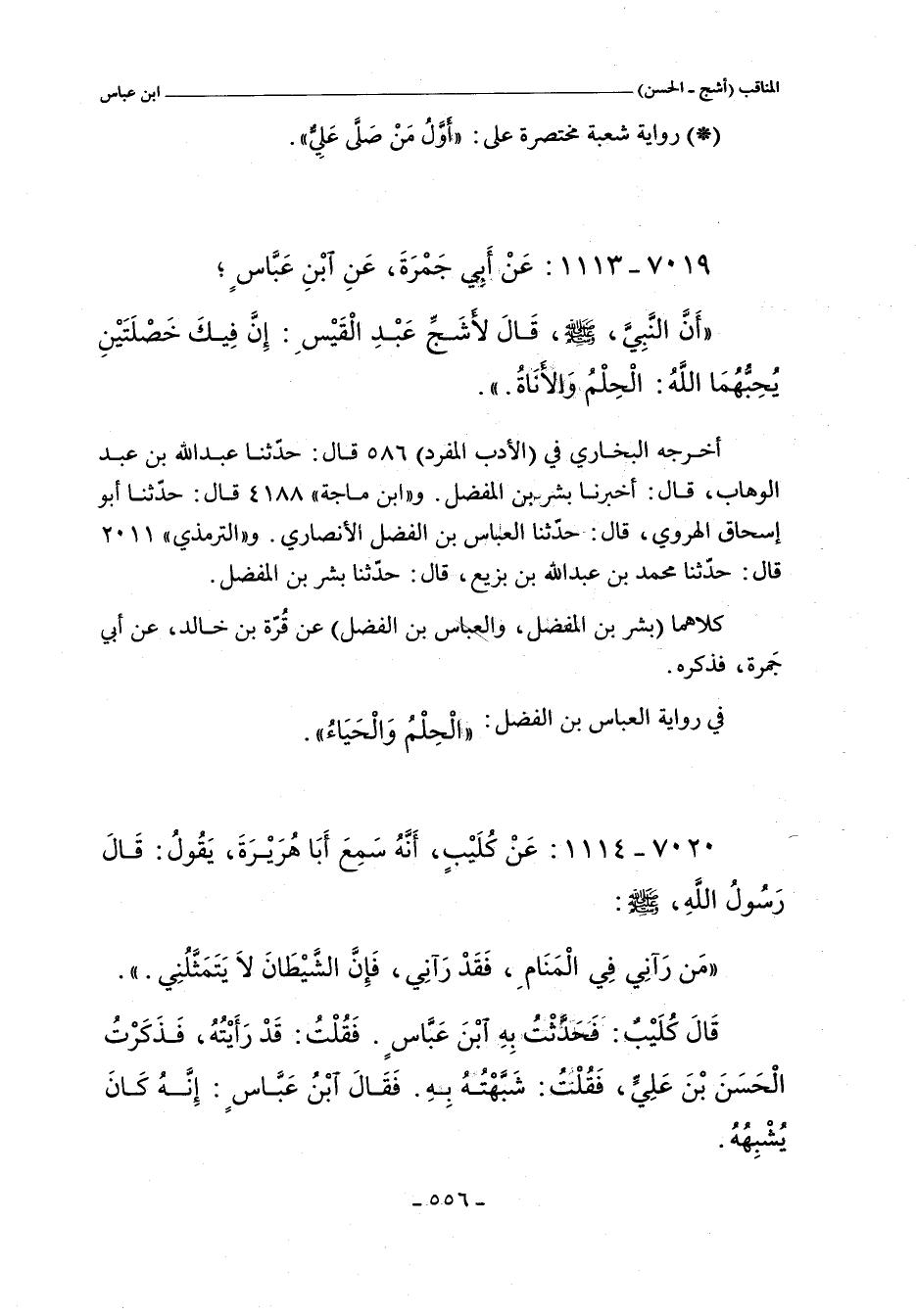 - لفظ العباس بن الفضل: أَنَّ النَّبِىَّ صلى الله عليه وسلم قَالَ لِلأَشَجِّ الْعَصَرِىِّ إِنَّ فِيكَ خَصْلَتَيْنِ يُحِبُّهُمَا اللَّهُ الْحِلْمَ وَالْحَيَاءَ.