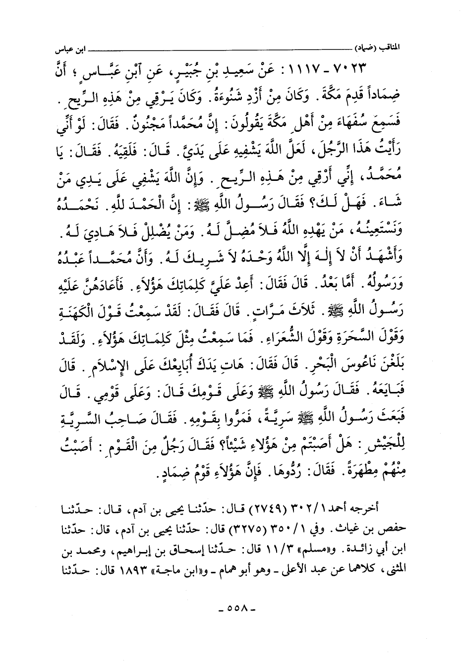 ٧٠٢٣ - عَنْ سَعِيدِ بْنِ جُبَيْرٍ عَنِ ابْنِ عَبَّاسٍ أَنَّ ضِمَادًا قَدِمَ مَكَّةَ وَكَانَ مِنْ أَزْدِ شَنُوءَةَ وَكَانَ يَرْقِى مِنْ هَذِهِ الرِّيحِ فَسَمِعَ سُفَهَاءَ مِنْ أَهْلِ مَكَّةَ يَقُولُونَ إِنَّ مُحَمَّدًا مَجْنُونٌ. فَقَالَ لَوْ أَنِّى رَأَيْتُ هَذَا الرَّجُلَ لَعَلَّ اللَّهَ يَشْفِيهِ عَلَى يَدَىَّ قَالَ فَلَقِيَهُ فَقَالَ يَا مُحَمَّدُ إِنِّى أَرْقِى مِنْ هَذِهِ الرِّيحِ وَإِنَّ اللَّهَ يَشْفِى عَلَى يَدِى مَنْ شَاءَ فَهَلْ لَكَ فَقَالَ رَسُولُ اللَّهِ صلى الله عليه وسلم إِنَّ الْحَمْدَ لِلَّهِ نَحْمَدُهُ وَنَسْتَعِينُهُ مَنْ يَهْدِهِ اللَّهُ فَلَا مُضِلَّ لَهُ وَمَنْ يُضْلِلْ فَلَا هَادِىَ لَهُ وَأَشْهَدُ أَنْ لَا إِلَهَ إِلَاّ اللَّهُ وَحْدَهُ لَا شَرِيكَ لَهُ وَأَنَّ مُحَمَّدًا عَبْدُهُ وَرَسُولُهُ أَمَّا بَعْدُ قَالَ فَقَالَ أَعِدْ عَلَىَّ كَلِمَاتِكَ هَؤُلَاءِ. فَأَعَادَهُنَّ عَلَيْهِ رَسُولُ اللَّهِ صلى الله عليه وسلم ثَلَاثَ مَرَّاتٍ قَالَ فَقَالَ لَقَدْ سَمِعْتُ قَوْلَ الْكَهَنَةِ وَقَوْلَ السَّحَرَةِ وَقَوْلَ الشُّعَرَاءِ فَمَا سَمِعْتُ مِثْلَ كَلِمَاتِكَ هَؤُلَاءِ وَلَقَدْ بَلَغْنَ نَاعُوسَ الْبَحْرِ قَالَ فَقَالَ هَاتِ يَدَكَ أُبَايِعْكَ عَلَى الإِسْلَامِ قَالَ فَبَايَعَهُ. فَقَالَ رَسُولُ اللَّهِ صلى الله عليه وسلم وَعَلَى قَوْمِكَ قَالَ وَعَلَى قَوْمِى قَالَ فَبَعَثَ رَسُولُ اللَّهِ صلى الله عليه وسلم سَرِيَّةً فَمَرُّوا بِقَوْمِهِ فَقَالَ صَاحِبُ السَّرِيَّةِ لِلْجَيْشِ هَلْ أَصَبْتُمْ مِنْ هَؤُلَاءِ شَيْئًا فَقَالَ رَجُلٌ مِنَ الْقَوْمِ أَصَبْتُ مِنْهُمْ مِطْهَرَةً. فَقَالَ رُدُّوهَا فَإِنَّ هَؤُلَاءِ قَوْمُ ضِمَادٍ.