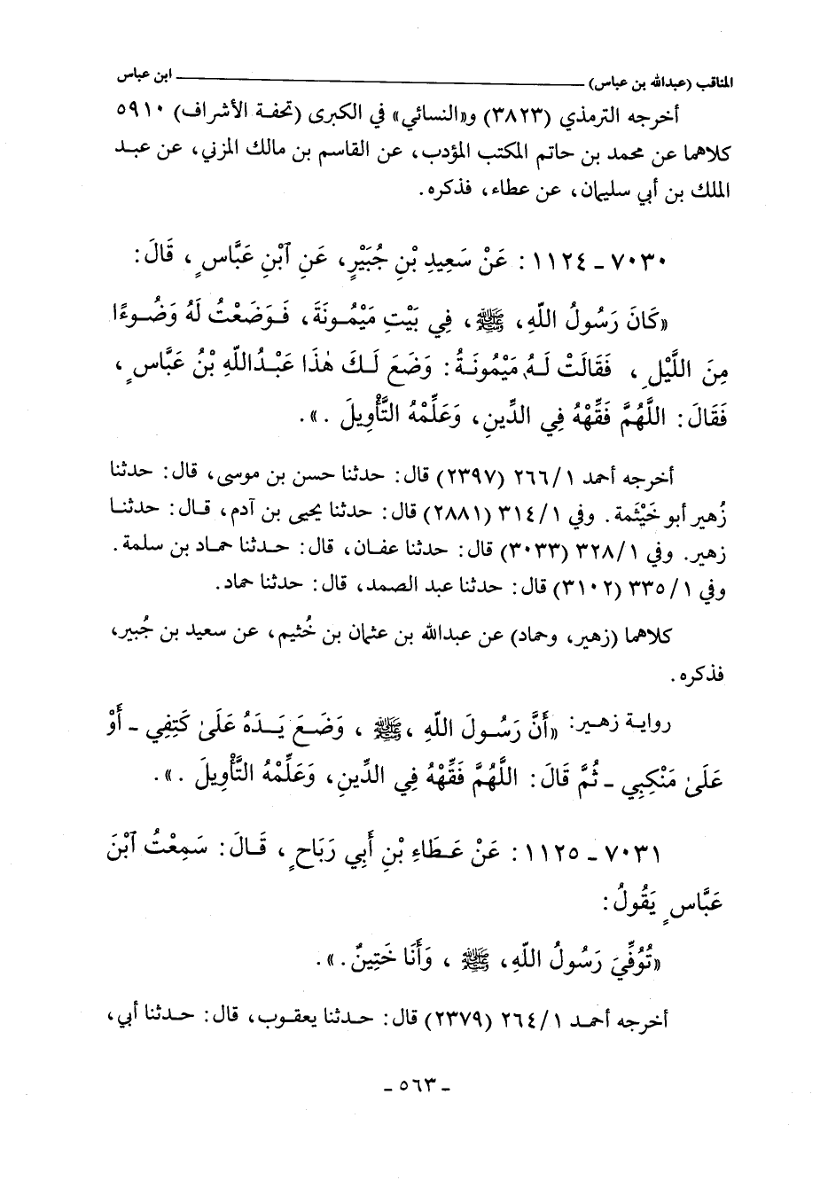 - وفي رواية: أَنَّ رَسُولَ اللَّهِ صلى الله عليه وسلم وَضَعَ يَدَهُ عَلَى كَتِفِى - أَوْ عَلَى مَنْكِبِى شَكَّ سَعِيدٌ - ثُمَّ قَالَ «اللَّهُمَّ فَقِّهْهُ فِى الدِّينِ وَعَلِّمْهُ التَّأْوِيلَ.