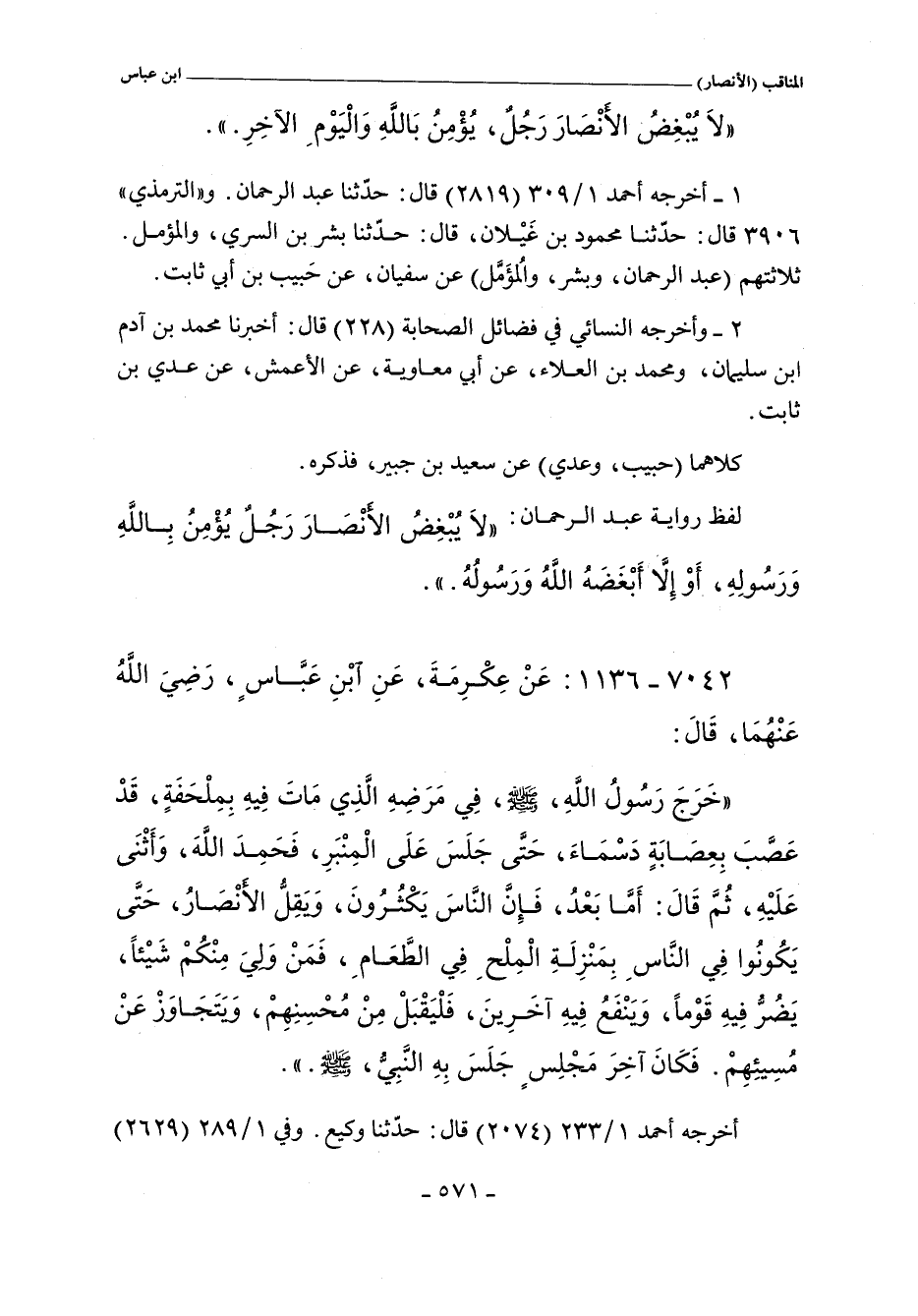 أخرجه أحمد ١/ ٣٠٩ (٢٨١٩) قال: حدثنا عبد الرحمن , عن سفيان , عن حبيب. والتِّرْمِذِيّ" ٣٩٠٦ قال: حدثنا محمود بن غَيْلان، حدثنا بشر بن السري، والمؤمل. قالا: حدثنا سفيان , عن حبيب بن أبي ثابت. و"النَّسَائي" في "الكبرى" ٨٢٧٥ قال: أخبرنا محمد بن آدم ابن سليمان، ومحمد بن العلاء، عن أبي معاوية، عن الأعمش، عن عدي بن ثابت.