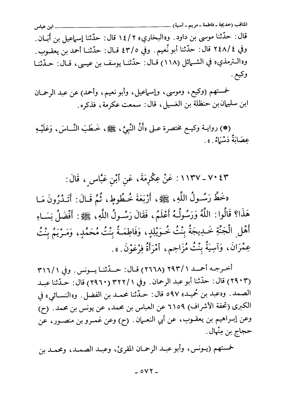 خَطَّ رَسُولُ اللَّهِ صلى الله عليه وسلم فِى الأَرْضِ أَرْبَعَةَ خُطُوطٍ قَالَ أَتَدْرُونَ مَا هَذَا قَالُوا اللَّهُ وَرَسُولُهُ أَعْلَمُ. فَقَالَ رَسُولُ اللَّهِ صلى الله عليه وسلم أَفْضَلُ نِسَاءِ أَهْلِ الْجَنَّةِ خَدِيجَةُ بِنْتُ خُوَيْلِدٍ وَفَاطِمَةُ بِنْتُ مُحَمَّدٍ وَمَرْيَمُ بِنْتُ عِمْرَانَ وَآسِيَةُ بِنْتُ مُزَاحِمٍ امْرَأَةُ فِرْعَوْنَ.