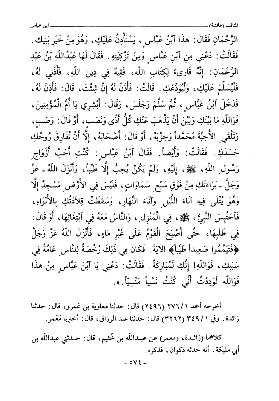 الرَّحْمَنِ فَقَالَ هَذَا ابْنُ عَبَّاسٍ يَسْتَأْذِنُ عَلَيْكِ وَهُوَ مِنْ خَيْرِ بَنِيكِ. فَقَالَتْ دَعْنِى مِنِ ابْنِ عَبَّاسٍ وَمِنْ تَزْكِيَتِهِ. فَقَالَ لَهَا عَبْدُ اللَّهِ بْنُ عَبْدِ الرَّحْمَنِ إِنَّهُ قَارِئٌ لِكِتَابِ اللَّهِ فَقِيهٌ فِى دِينِ اللَّهِ فَائْذَنِى لَهُ فَلْيُسَلِّمْ عَلَيْكِ وَلْيُوَدِّعْكِ. قَالَتْ فَائْذَنْ لَهُ إِنْ شِئْتَ. قَالَ فَأَذِنَ لَهُ فَدَخَلَ ابْنُ عَبَّاسٍ ثُمَّ سَلَّمَ وَجَلَسَ وَقَالَ أَبْشِرِى يَا أُمَّ الْمُؤْمِنِينَ فَوَاللَّهِ مَا بَيْنَكِ وَبَيْنَ أَنْ يَذْهَبَ عَنْكِ كُلُّ أَذًى وَنَصَبٍ أَوْ قَالَ وَصَبٍ وَتَلْقَىِ الأَحِبَّةَ مُحَمَّدًا وَحِزْبَهُ أَوْ قَالَ أَصْحَابَهُ إِلَاّ أَنْ تُفَارِقَ رُوحُكِ جَسَدَكِ. فَقَالَتْ وَأَيْضًا. فَقَالَ ابْنُ عَبَّاسٍ كُنْتِ أَحَبَّ أَزْوَاجِ رَسُولِ اللَّهِ صلى الله عليه وسلم إِلَيْهِ وَلَمْ يَكُنْ يُحِبُّ إِلَاّ طَيِّبًا وَأَنْزَلَ اللَّهُ عَزَّ وَجَلَّ بَرَاءَتَكِ مِنْ فَوْقِ سَبْعِ سَمَوَاتٍ فَلَيْسَ فِى الأَرْضِ مَسْجِدٌ إِلَاّ وَهُوَ يُتْلَى فِيهِ آنَاءَ اللَّيْلِ وَآنَاءَ النَّهَارِ وَسَقَطَتْ قِلَادَتُكِ بِالأَبْوَاءِ فَاحْتَبَسَ النَّبِىُّ صلى الله عليه وسلم فِى الْمَنْزِلِ وَالنَّاسُ مَعَهُ فِى ابْتِغَائِهَا أَوْ قَالَ فِى طَلَبِهَا حَتَّى أَصْبَحَ الْقَوْمُ عَلَى غَيْرِ مَاءٍ فَأَنْزَلَ اللَّهُ عَزَّ وَجَلَّ (فَتَيَمَّمُوا صَعِيدًا طَيِّبًا) الآيَةَ فَكَانَ فِى ذَلِكَ رُخْصَةٌ لِلنَّاسِ عَامَّةً فِى سَبَبِكِ فَوَاللَّهِ إِنَّكِ لَمُبَارَكَةٌ. فَقَالَتْ دَعْنِى يَا ابْنَ عَبَّاسٍ مِنْ هَذَا فَوَاللَّهِ لَوَدِدْتُ أَنِّى
