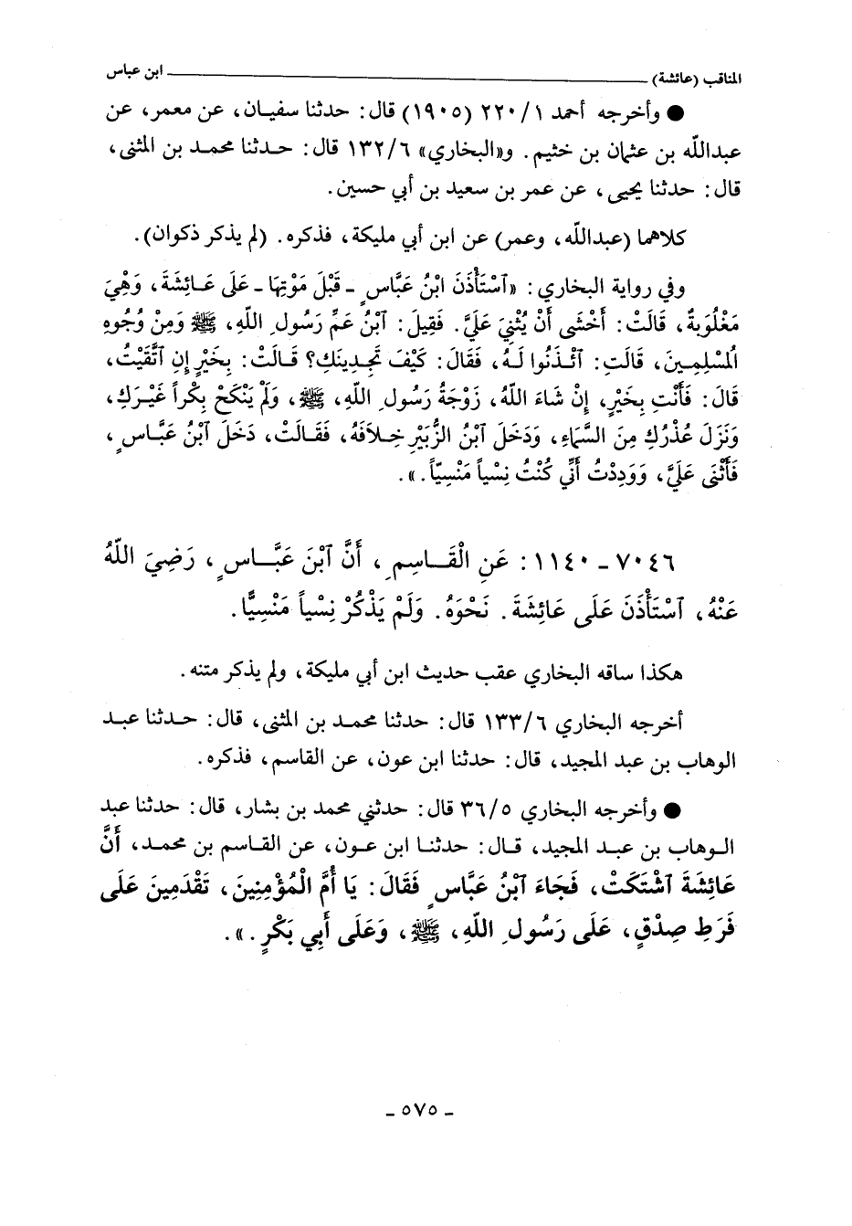 - لفظ عبد الله بن عثمان: عَنِ ابْنِ أَبِى مُلَيْكَةَ إِنْ شَاءَ اللَّهُ يَعْنِى اسْتَأْذَنَ ابْنُ عَبَّاسٍ عَلَى عَائِشَةَ فَلَمْ يَزَلْ بِهَا بَنُو أَخِيهَا قَالَتْ أَخَافُ أَنْ يُزَكِّينَِى. فَلَمَّا أَذِنَتْ لَهُ قَالَ مَا بَيْنَكِ وَبَيْنَ أَنْ تَلْقَىِ الأَحِبَّةَ إِلَاّ أَنْ يُفَارِقَ الرُّوحُ الْجَسَدَ كُنْتِ أَحَبَّ أَزْوَاجِ رَسُولِ اللَّهِ صلى الله عليه وسلم إِلَيْهِ وَلَمْ يَكُنْ يُحِبُّ رَسُولُ اللَّهِ صلى الله عليه وسلم إِلَاّ طَيِّبًا وَسَقَطَتْ قِلَادَتُكِ لَيْلَةَ الأَبْوَاءِ فَنَزَلَتْ فِيكِ آيَاتٌ مِنَ الْقُرْآنِ فَلَيْسَ مَسْجِدٌ مِنْ مَسَاجِدِ الْمُسْلِمِينَ إِلَاّ يُتْلَى فِيهِ عُذْرُكِ آنَاءَ اللَّيْلِ وَآنَاءَ النَّهَارِ. فَقَالَتْ دَعْنِى مِنْ تَزْكِيَتِكَ يَا ابْنَ عَبَّاسٍ فَوَاللَّهِ لَوَدِدْتُ.