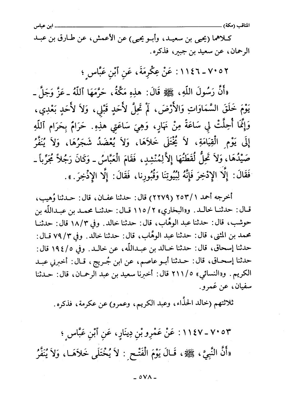 أَنَّ رَسُولَ اللَّهِ صلى الله عليه وسلم قَالَ هَذِهِ مَكَّةُ حَرَّمَهَا اللَّهُ عَزَّ وَجَلَّ يَوْمَ خَلَقَ السَّمَوَاتِ وَالأَرْضَ لَمْ تَحِلَّ لأَحَدٍ قَبْلِى وَلَا لأَحَدٍ بَعْدِى وَإِنَّمَا أُحِلَّتْ لِى سَاعَةً مِنْ نَهَارٍ وَهِىَ سَاعَتِى هَذِهِ حَرَامٌ بِحَرَامِ اللَّهِ إِلَى يَوْمِ الْقِيَامَةِ لَا يُخْتَلَى خَلَاهَا وَلَا يُعْضَدُ شَجَرُهَا وَلَا يُنَفَّرُ صَيْدُهَا وَلَا تَحِلُّ لُقَطَتُهَا إِلَاّ لِمُنْشِدٍ فَقَامَ الْعَبَّاسُ وَكَانَ رَجُلاً مُجَرِّبًا فَقَالَ إِلَاّ الإِذْخِرَ فَإِنَّهُ لِبُيُوتِنَا وَقُبُورِنَا. فَقَالَ إِلَاّ الإِذْخِرَ.