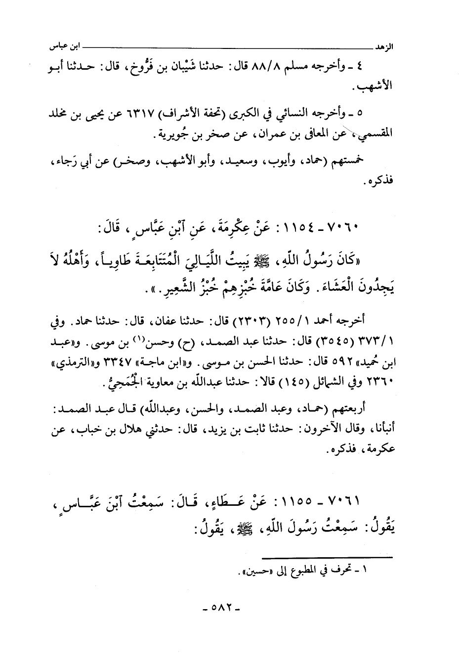 أخرجه أحمد ١/ ٢٥٥ (٢٣٠٣) قال: حدثنا عفان. وفي ١/ ٣٧٣ (٣٥٤٥) قال: حدثنا عبد الصمد، وحسن بن موسى. و (عبد بن حميد) ٥٩٢ قال: حدثنا الحسن بن موسى. و (اابن ماجة) ٣٣٤٧ قال: حدثنا عبد الله بن معاوية الْجُمَحي. والتِّرْمِذِيّ" ٢٣٦٠ , وفي (الشمائل) ١٤٥ قال: حدثنا عبد الله بن معاوية الجمحي.