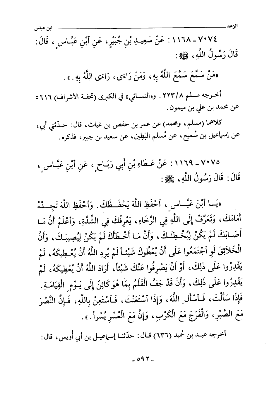 يَا ابْنَ عَبَّاسٍ، احْفَظِ اللَّهَ يَحْفَظْكَ. وَاحْفَظِ اللَّهَ تَجِدْهُ أَمَامَكَ، وَتَعَرَّفْ اِلَى الله فِي الرَّخَاءِ، يَعْرِفْكَ فِي الشِّدَّةِ، وَاعْلَمْ أَنَ مَا أَصَابَكَ لَمْ يَكُنْ لِيُخْطِئَكَ، وَأَنَّ مَا أَخْطَأَكَ لَمْ يَكُنْ لِيُصِيبَكَ، وَأَنَّ الْخَلأَئِقَ لَوِ اجْتَمَعُوا عَلَى أَنْ يُعْطُوكَ شَيْئًا لَمْ يُرِدِ اللَّهُ أَنْ يُعْطِيكَهُ، لَمْ يَقْدِرُرا عَلَى ذَلِكَ، أَوْ أَنْ يَصْرِفُوا عَنْكَ شَيْئًا، أَرَادَ اللَّهُ أَنْ يُعْطِيكَهُ، لَمْ يَقْدِرُوا عَلَى ذَلِكَ، وَأَنْ قَدْ جَفَّ الْقَلَمُ بِفَا هُوَكَائِنٌ اِلَى يَوْمِ الْقِيَامَةِ. فَاِذَا سَأَلْتَ، فَاسْأَلِ اللَّهَ، وِاذَا اسْتَعَنْتَ، فَاسْتَعِنْ بِالله، فَاِنَّ النَّصْرَ مَعَ الصَّبْرِ، وَالْفَرَجَ مَعَ الْكَرْبِ، وِانَّ مَعَ الْعُسْرِ يُسْرًا.