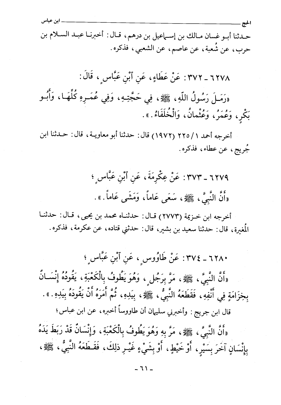 أَنَّ النَّبِىَّ صلى الله عليه وسلم مَرَّ بِرَجُلٍ وَهُوَ يَطُوفُ بِالْكَعْبَةِ يَقُودُهُ إِنْسَانٌ بِخِزَامَةٍ فِى أَنْفِهِ فَقَطَعَهُ النَّبِىُّ صلى الله عليه وسلم بِيَدِهِ ثُمَّ أَمَرَهُ أَنْ يَقُودَهُ بِيَدِهِ. قَالَ ابْنُ جُرَيْجٍ وَأَخْبَرَنِى سُلَيْمَانُ أَنَّ طَاوُسًا أَخْبَرَهُ عَنِ ابْنِ عَبَّاسٍ؛