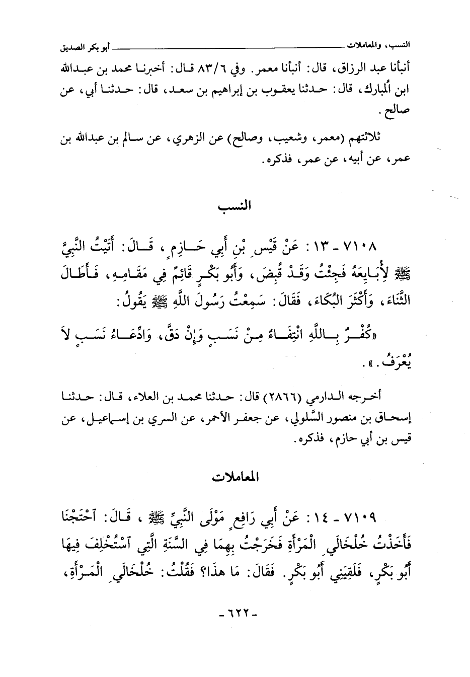 أنبأنا عبد الرزاق، قال: أنبأنا معمر. وفي ٦/ ٨٣ قال: أخبرنا محمد بن عبد الله بن الُمبارك، قال: حدَّثنا يعقوب بن إبراهيم بن سعد، قال: حدَّثنا أبي، عن صالح.