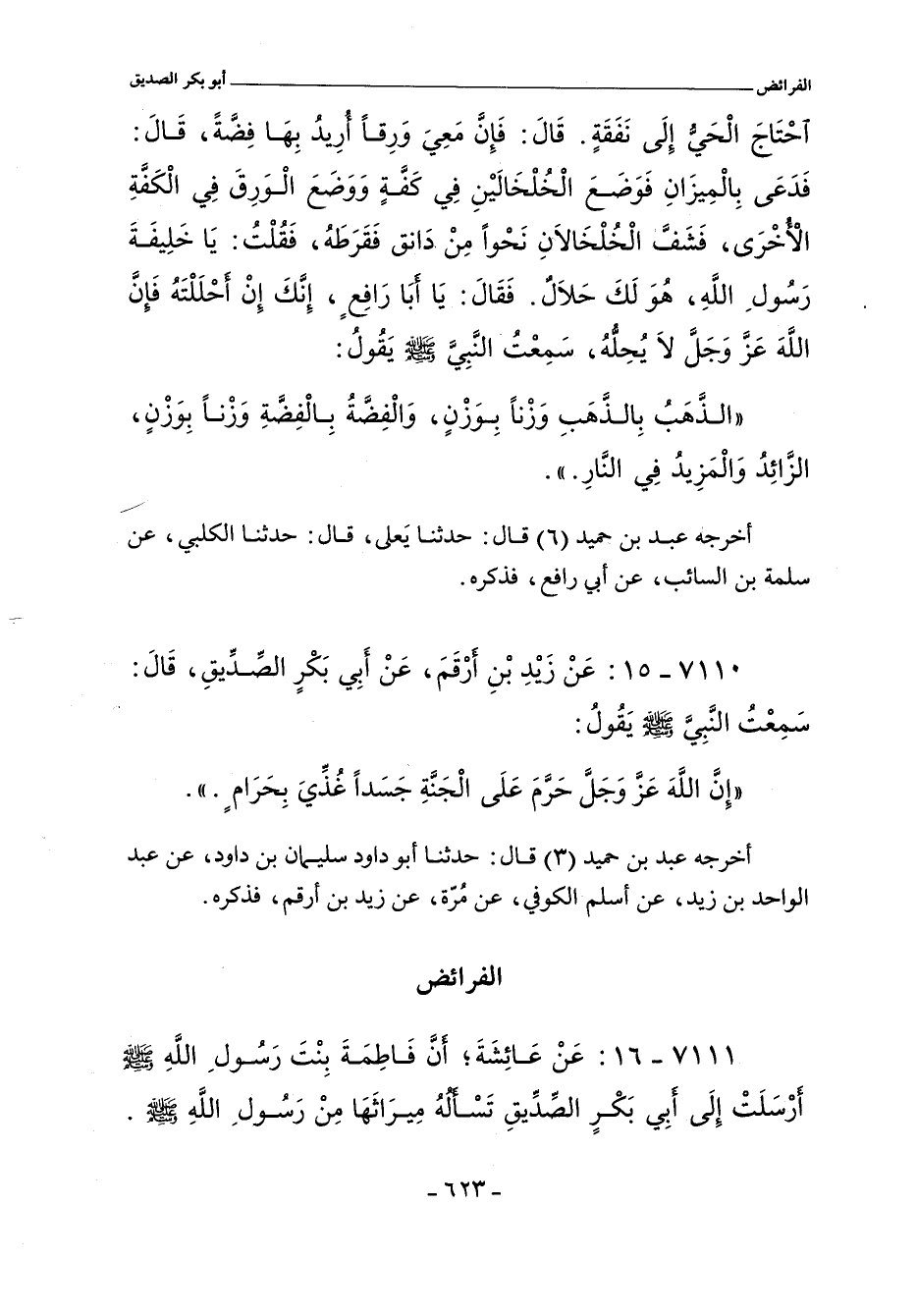 احْتَاجَ الْحَيُّ إِلَى نَفَقَةٍ. قَالَ: فَإِنَّ مَعِيَ وَرِقًا أرِيدُ بِهَا فِضَّةً، قَالَ: فَدَعَى بِالْمِيزَانِ فَوَضَعَ الْخُلْخَالَيْنِ فِي كَفَّةٍ وَوَضَعَ الْوَرِقَ فِي الْكَفَّةِ الأخْرَى، فَشَفَّ الْخُلْخَالَانِ نَحْوًا مِنْ دَانق فَقَرَطَهُ، فَقُلْتُ: يَا خَلِيفَةَ رَسُولِ اللَّهِ، هُوَ لَكَ حَلَالٌ. فَقَالَ: يَا أبَى رَافِعٍ، إِنَّكَ إِنْ أحْلَلْتَهُ فَإِنَّ اللَّهَ عَزَّ وَجَلَّ لَا يُحِلُّهُ، سَمعتُ النَّبِيَّ صلى الله عليه وسلم يَقُولُ: