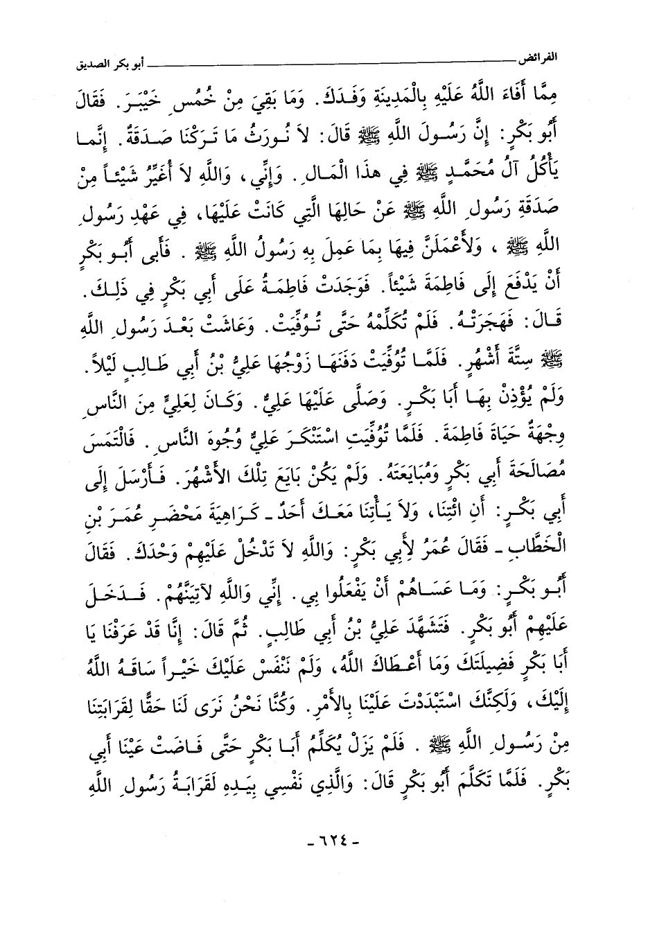 مِمَّا أَفَاءَ اللَّهُ عَلَيْهِ بِالْمَدِينَةِ وَفَدَكٍ وَمَا بَقِىَ مِنْ خُمْسِ خَيْبَرَ فَقَالَ أَبُو بَكْرٍ إِنَّ رَسُولَ اللَّهِ صلى الله عليه وسلم قَالَ لَا نُورَثُ مَا تَرَكْنَا صَدَقَةٌ إِنَّمَا يَأْكُلُ آلُ مُحَمَّدٍ - صلى الله عليه وسلم - فِى هَذَا الْمَالِ. وَإِنِّى وَاللَّهِ لَا أُغَيِّرُ شَيْئًا مِنْ صَدَقَةِ رَسُولِ اللَّهِ صلى الله عليه وسلم عَنْ حَالِهَا الَّتِى كَانَتْ عَلَيْهَا فِى عَهْدِ رَسُولِ اللَّهِ صلى الله عليه وسلم وَلأَعْمَلَنَّ فِيهَا بِمَا عَمِلَ بِهِ رَسُولُ اللَّهِ صلى الله عليه وسلم فَأَبَى أَبُو بَكْرٍ أَنْ يَدْفَعَ إِلَى فَاطِمَةَ شَيْئًا فَوَجَدَتْ فَاطِمَةُ عَلَى أَبِى بَكْرٍ فِى ذَلِكَ - قَالَ - فَهَجَرَتْهُ فَلَمْ تُكَلِّمْهُ حَتَّى تُوُفِّيَتْ وَعَاشَتْ بَعْدَ رَسُولِ اللَّهِ صلى الله عليه وسلم سِتَّةَ أَشْهُرٍ فَلَمَّا تُوُفِّيَتْ دَفَنَهَا زَوْجُهَا عَلِىُّ بْنُ أَبِى طَالِبٍ لَيْلاً وَلَمْ يُؤْذِنْ بِهَا أَبَا بَكْرٍ وَصَلَّى عَلَيْهَا عَلِىٌّ وَكَانَ لِعَلِىٍّ مِنَ النَّاسِ وِجْهَةٌ حَيَاةَ فَاطِمَةَ فَلَمَّا تُوُفِّيَتِ اسْتَنْكَرَ عَلِىٌّ وُجُوهَ النَّاسِ فَالْتَمَسَ مُصَالَحَةَ أَبِى بَكْرٍ وَمُبَايَعَتَهُ وَلَمْ يَكُنْ بَايَعَ تِلْكَ الأَشْهُرَ فَأَرْسَلَ إِلَى أَبِى بَكْرٍ أَنِ ائْتِنَا وَلَا يَأْتِنَا مَعَكَ أَحَدٌ - كَرَاهِيَةَ مَحْضَرِ عُمَرَ بْنِ الْخَطَّابِ - فَقَالَ عُمَرُ لأَبِى بَكْرٍ وَاللَّهِ لَا تَدْخُلْ عَلَيْهِمْ وَحْدَكَ. فَقَالَ أَبُو بَكْرٍ وَمَا عَسَاهُمْ أَنْ يَفْعَلُوا بِى إِنِّى وَاللَّهِ لآتِيَنَّهُمْ. فَدَخَلَ