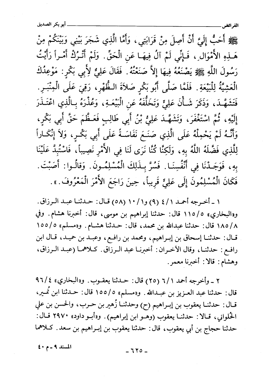 صلى الله عليه وسلم أَحَبُّ إِلَىَّ أَنْ أَصِلَ مِنْ قَرَابَتِى وَأَمَّا الَّذِى شَجَرَ بَيْنِى وَبَيْنَكُمْ مِنْ هَذِهِ الأَمْوَالِ فَإِنِّى لَمْ آلُ فِيهِ عَنِ الْحَقِّ وَلَمْ أَتْرُكْ أَمْرًا رَأَيْتُ رَسُولَ اللَّهِ صلى الله عليه وسلم يَصْنَعُهُ فِيهَا إِلَاّ صَنَعْتُهُ. فَقَالَ عَلِىٌّ لأَبِى بَكْرٍ مَوْعِدُكَ الْعَشِيَّةُ لِلْبَيْعَةِ. فَلَمَّا صَلَّى أَبُو بَكْرٍ صَلَاةَ الظُّهْرِ رَقِىَ عَلَى الْمِنْبَرِ فَتَشَهَّدَ وَذَكَرَ شَأْنَ عَلِىٍّ وَتَخَلُّفَهُ عَنِ الْبَيْعَةِ وَعُذْرَهُ بِالَّذِى اعْتَذَرَ إِلَيْهِ ثُمَّ اسْتَغْفَرَ وَتَشَهَّدَ عَلِىُّ بْنُ أَبِى طَالِبٍ فَعَظَّمَ حَقَّ أَبِى بَكْرٍ وَأَنَّهُ لَمْ يَحْمِلْهُ عَلَى الَّذِى صَنَعَ نَفَاسَةً عَلَى أَبِى بَكْرٍ وَلَا إِنْكَارًا لِلَّذِى فَضَّلَهُ اللَّهُ بِهِ وَلَكِنَّا كُنَّا نَرَى لَنَا فِى الأَمْرِ نَصِيبًا فَاسْتُبِدَّ عَلَيْنَا بِهِ فَوَجَدْنَا فِى أَنْفُسِنَا فَسُرَّ بِذَلِكَ الْمُسْلِمُونَ وَقَالُوا أَصَبْتَ. فَكَانَ الْمُسْلِمُونَ إِلَى عَلِىٍّ قَرِيبًا حِينَ رَاجَعَ الأَمْرَ الْمَعْرُوفَ.