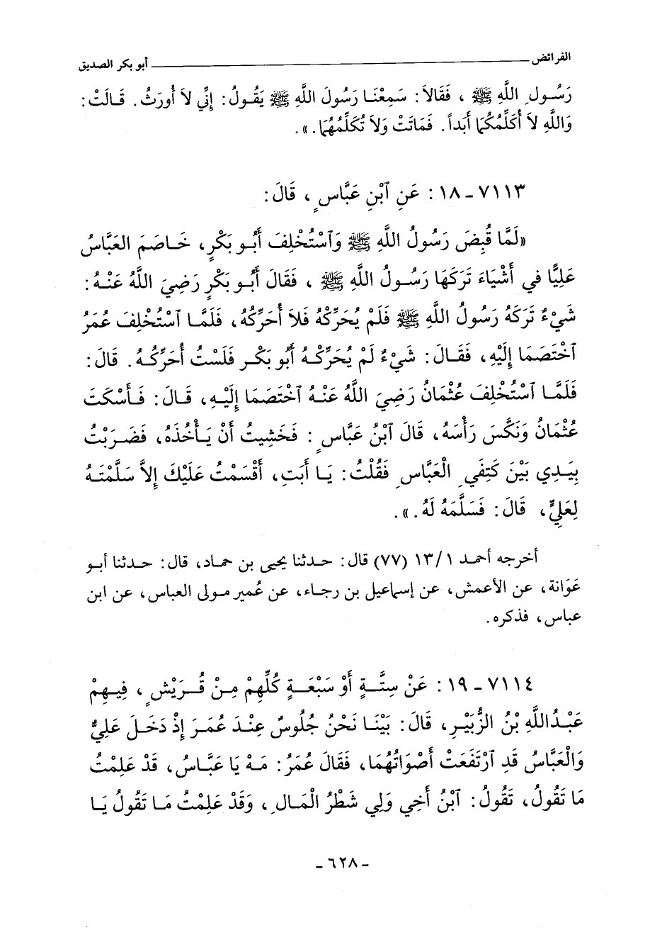 ٧١١٣ - عَنِ آبْنِ عَبَّاسٍ، قَالَ: لَمَّا قُبِضَ رَسُولُ اللَّهِ صلى الله عليه وسلم وَاسْتُخْلِفَ أَبُو بَكْرٍ، خَاصَمَ العَبَّاسُ عَلِيًّا في أَشْيَاءَ تَرَكَهَا رَسُولُ اللَّهِ صلى الله عليه وسلم، فَقَالَ أَبُو بَكْرٍ رَضِيَ اللَّهُ عَنْهُ: شَيء تَرَكَهُ رَسُولُ اللَّهِ صلى الله عليه وسلم فَلَمْ يُحَرِّكْهُ فَلَا أُحَرِّكُهُ، فَلَمَّا اسْتُخْلِفَ عُمَرُ اخْتَصَمَا إِلَيْهِ، فَقَالَ: شيء لَمْ يُحَرِّكْهُ أبو بَكْر فَلَسْتُ أحَرِّكُهُ. قَالَ: فَلَمَّا آسْتُخْلِفَ عُثْمَانُ رَضِيَ اللَّهُ عَنْهُ اخْتَصَمَا إِلَيْهِ، قَالَ: فَأسْكَتَ عُثْمَانُ وَنَكَّسَ رَأْسَهُ، قَالَ ابْنُ عَبَّاسٍ: فَخَشِيتُ أنْ يَأْخُذَهُ، فَضَرَبْتُ بِيَدِي بَيْنَ كَتِفَيِ الْعَبَّاسِ فَقُلْتُ: يَا أَبَتِ، أَقْسَمْتُ عَلَيْكَ إِلَاّ سَلَّمْتَهُ لِعَيِنّ، قَالَ: فَسَلَّمَهُ لَهُ.